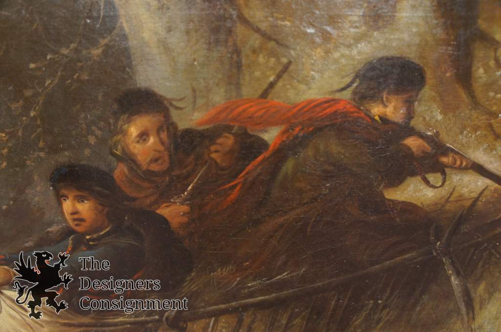19th Century Russian Oil Painting Depicting a hunt scene. Men can be seen on a Troika pulled by four horses as wolves attempt to ambush them. Men are frightened with their gunsholstered. The landscape is set in a woodland setting during winter. Birds are seen towards the upper left. Framed in wood with gold leaf. Signed with initials on the bottom right. Appears to to be LK