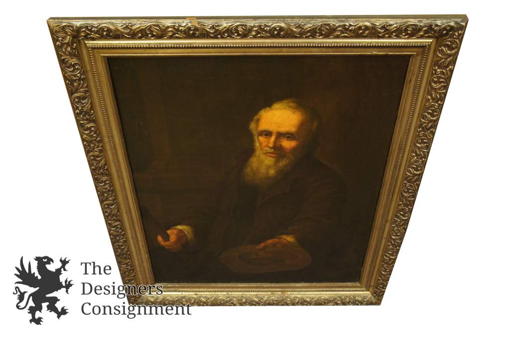Beautifully painted realist portrait showing a beggar. His hand can be seen outstretched, holding his hat with coins in it. Framed in Goldtone with floral trim. Circa Early-Mid 20th Century.
