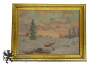 A neat early 20th Century Painting by one Mrs ML Bigger. Features a sunset scene on a winter day near a flowing river. Evergreens can be seen in the distance amongst pink clouds. Framed in Gold, and signed on the bottom right.