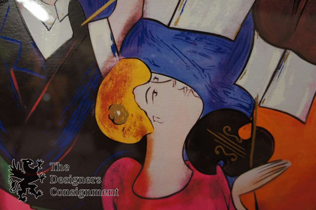 "Accounts" depicts seven musicians with instruments during a performance. Signed on the lower right and framed.