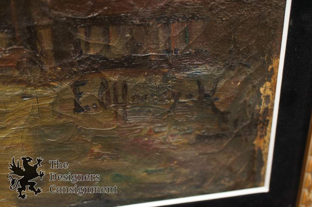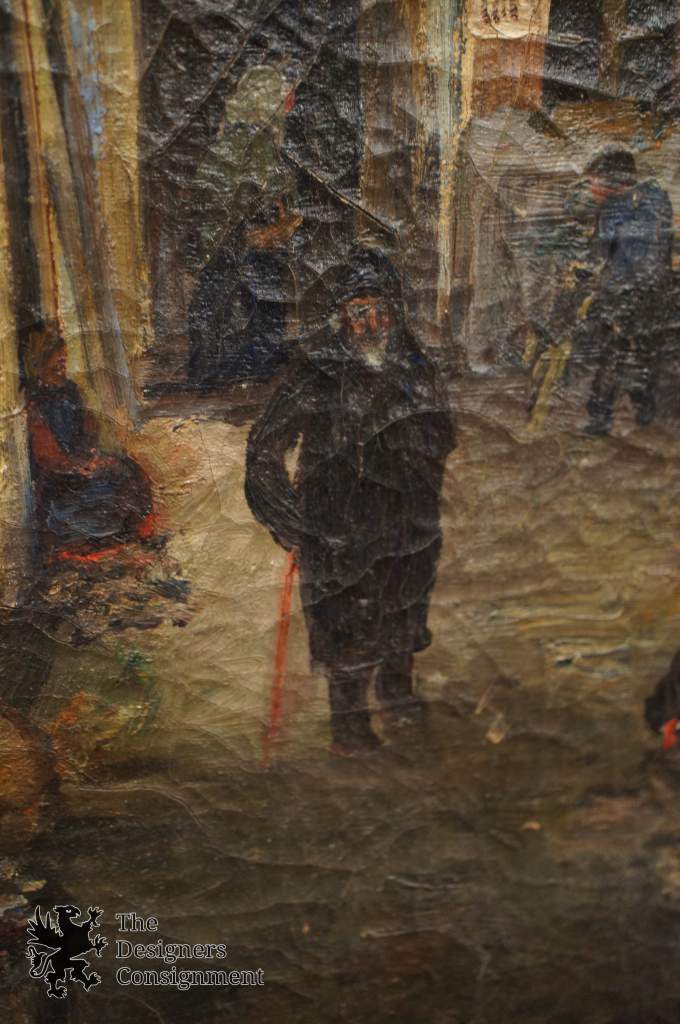 A beautiful cityscape oil painting on canvas with figures. Circa 1850s. The building in the distance says Sattlerei, which means saddlery and harness goods. Translated from German to English. The canvas is heavily aged with hardened paint, crazing and splitting. Framed in Gold-toned frame.