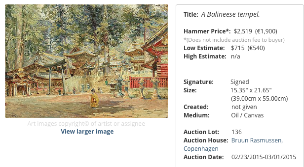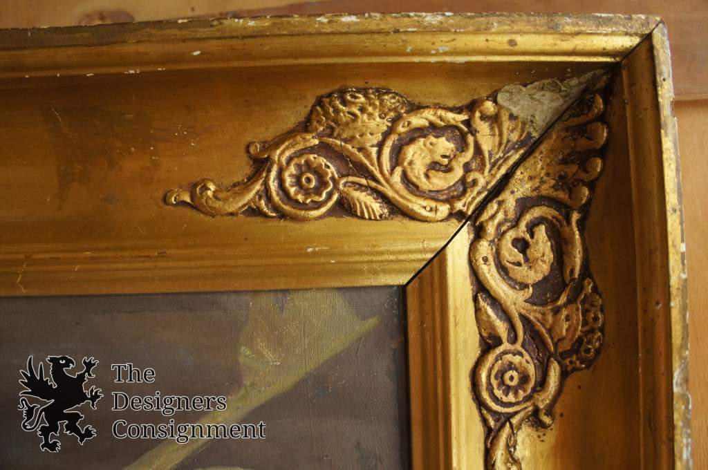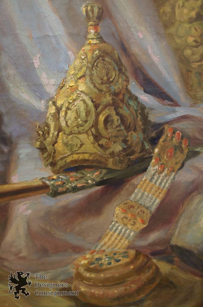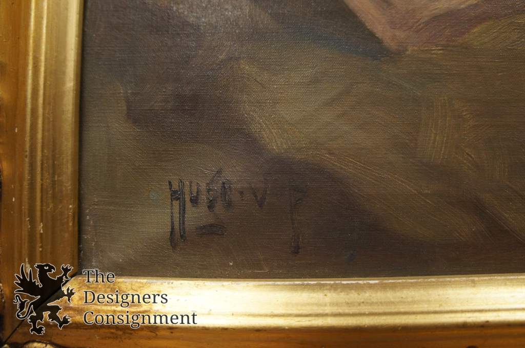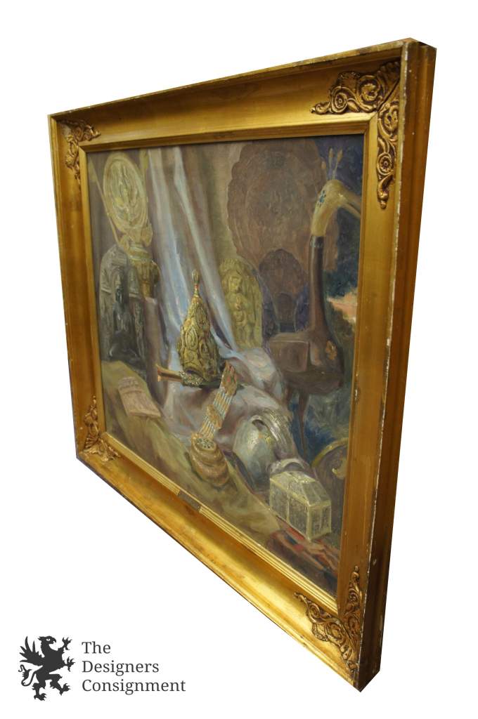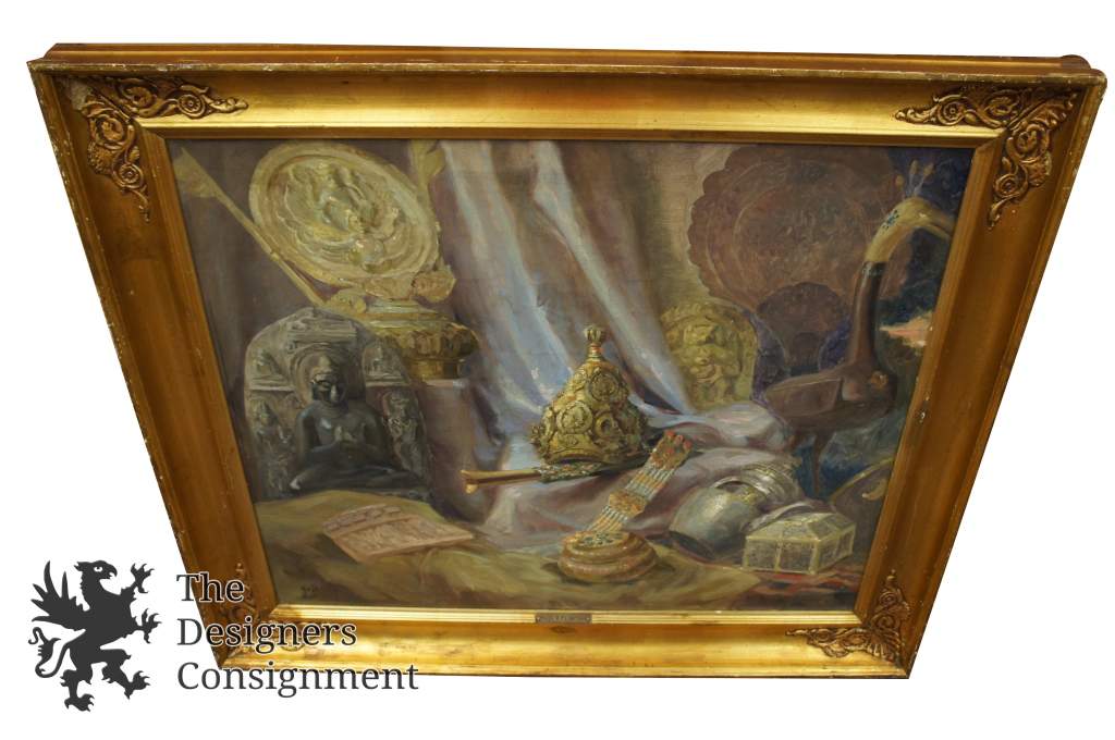 Here we have an amazing early 20th century work from Hugo from his time spent in India. The canvas shows age and character. Depicts a palace still life scene filled with royal items. A Gold Crown can be seen in the middle beside a Maharaja Meditating Buddha. In the background Hare high relief gold plaques as well as a bird statue. An authentic piece rich in color that will make a great addition to your collection. In the last photo an auction result can be seen of his work. The piece is smaller, but indicative of the character of his Artwork.
