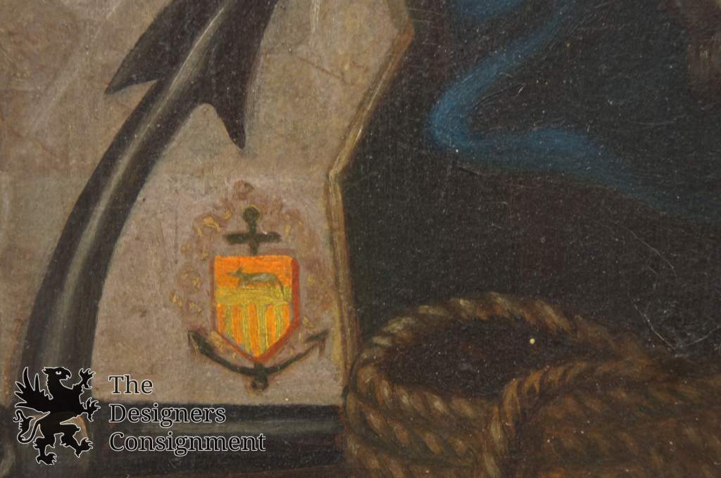 Antique Original 19th Century Oil. Features John Cabot the Venetian Explorer who discovered the coast of North America under thecommissionof Henry VII. A gallant traveler seen in front of the ships mast posing. The family coat of arms can be seepaintedbehind the anchor along the lower left. Painting on board in gold frame. Unsigned.
