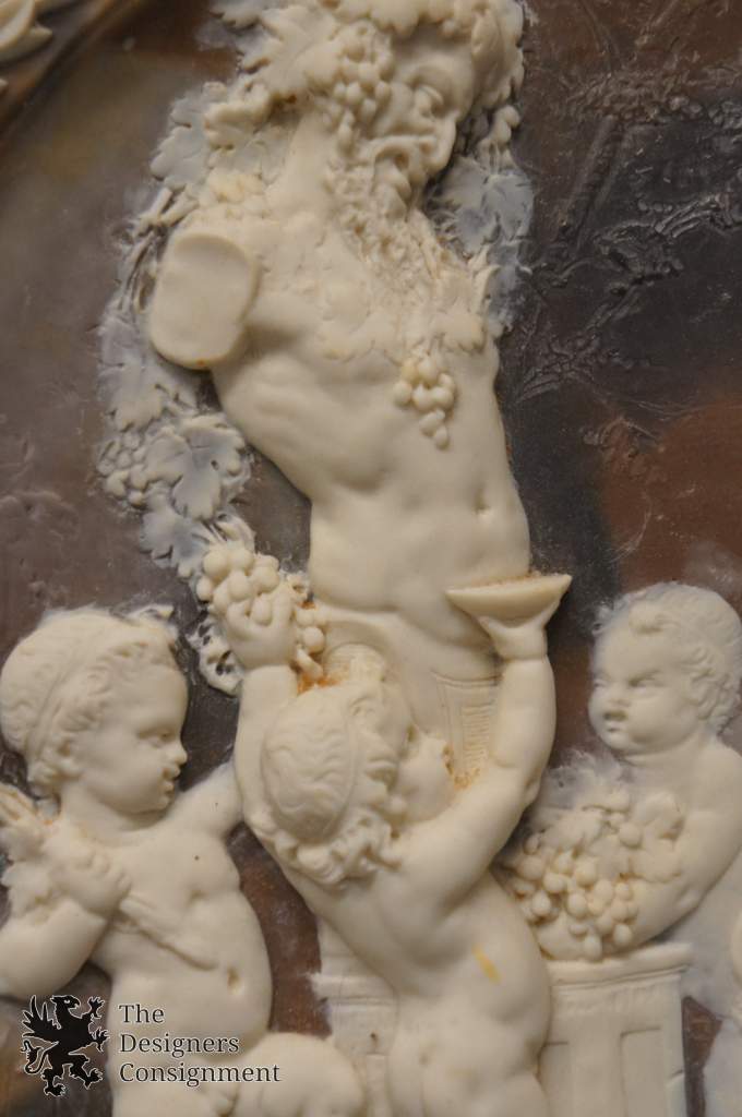 Jean-Baptiste Germain was active and lived in France, and is known for sculpting. Available here are two gorgeous high relief marble wall plaques. Made in the 70's from a composition of marble and resin. One is named Tribute to Bacchus, showing a scene with a bust of Bacchus, putti nymph and satyr. Signed along the lower left 1869. The other is unnamed, however also signed. Each has a bracket along the back for hanging