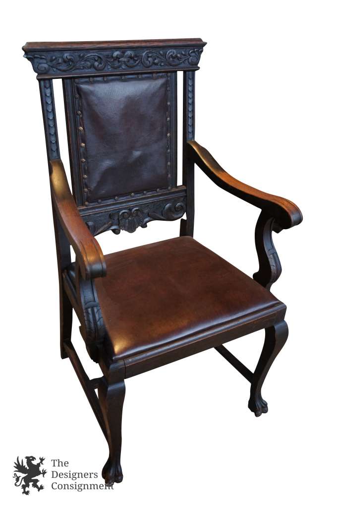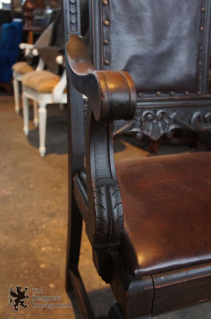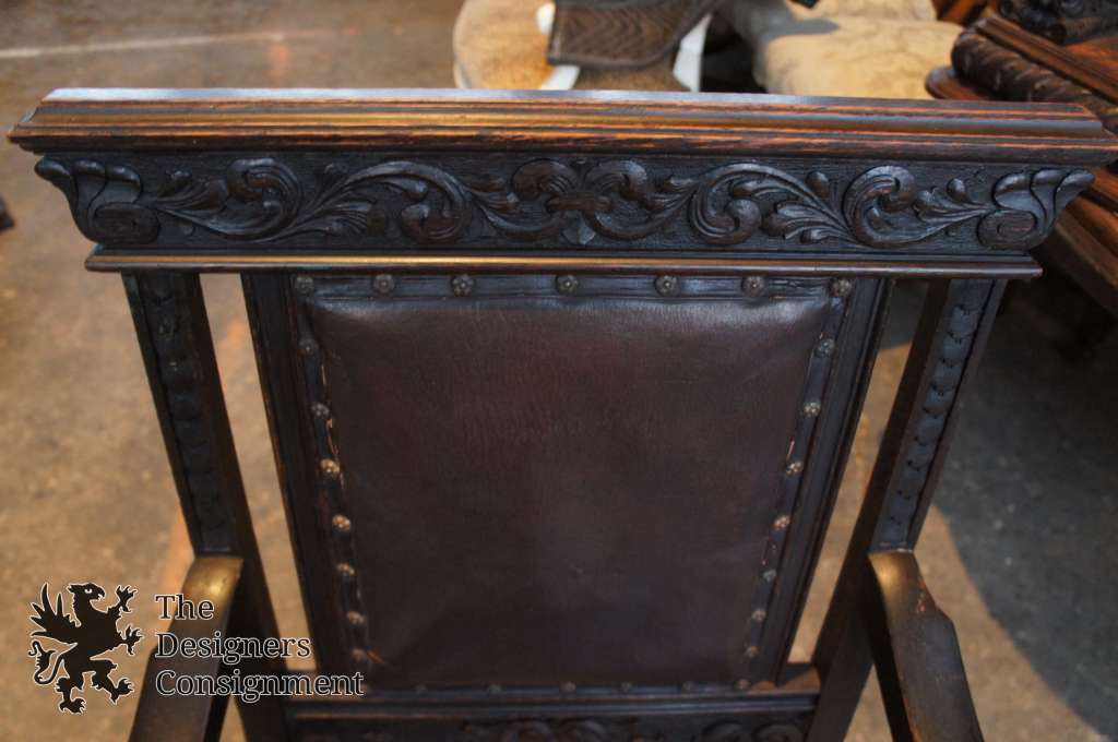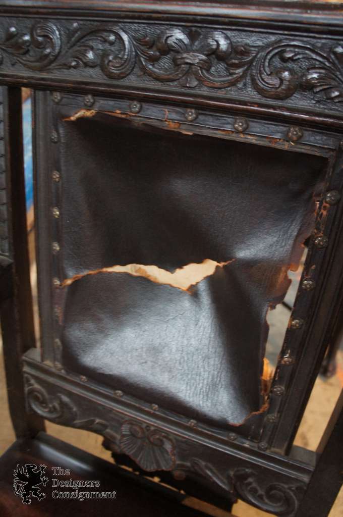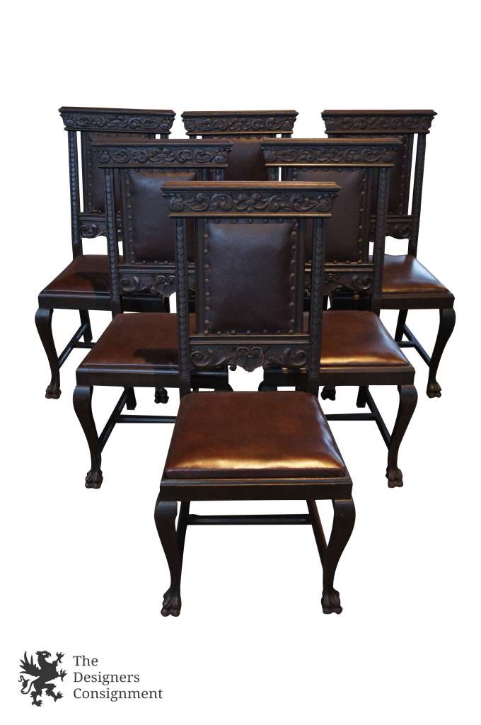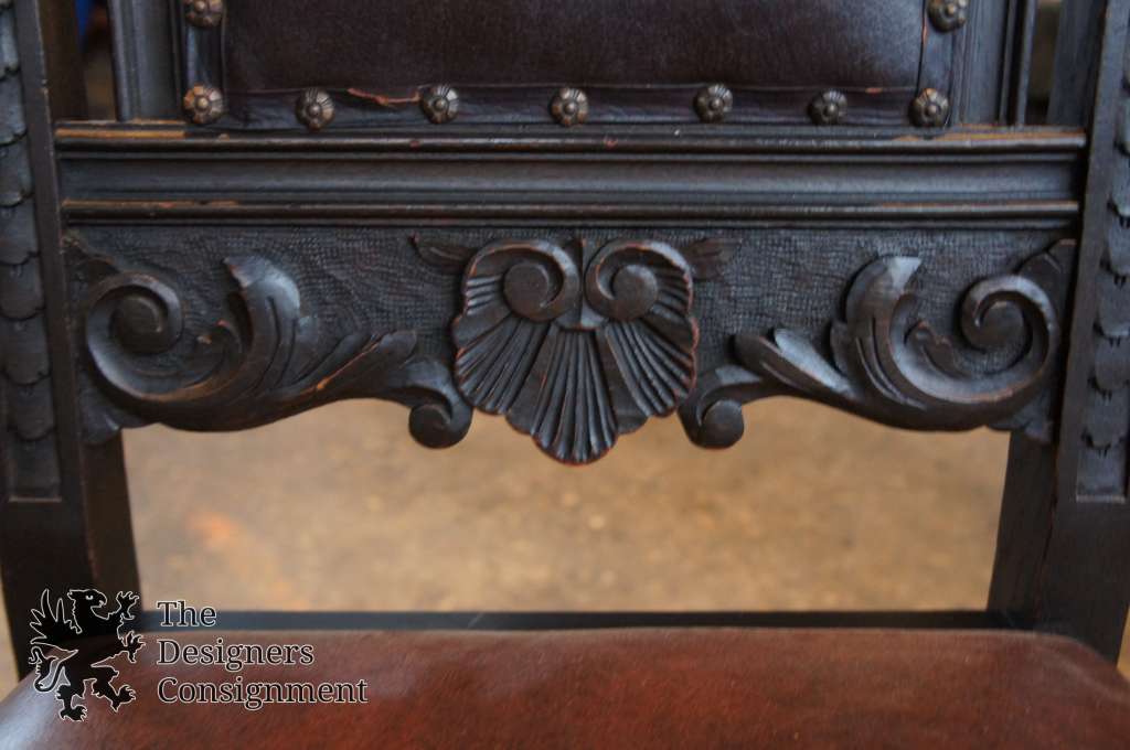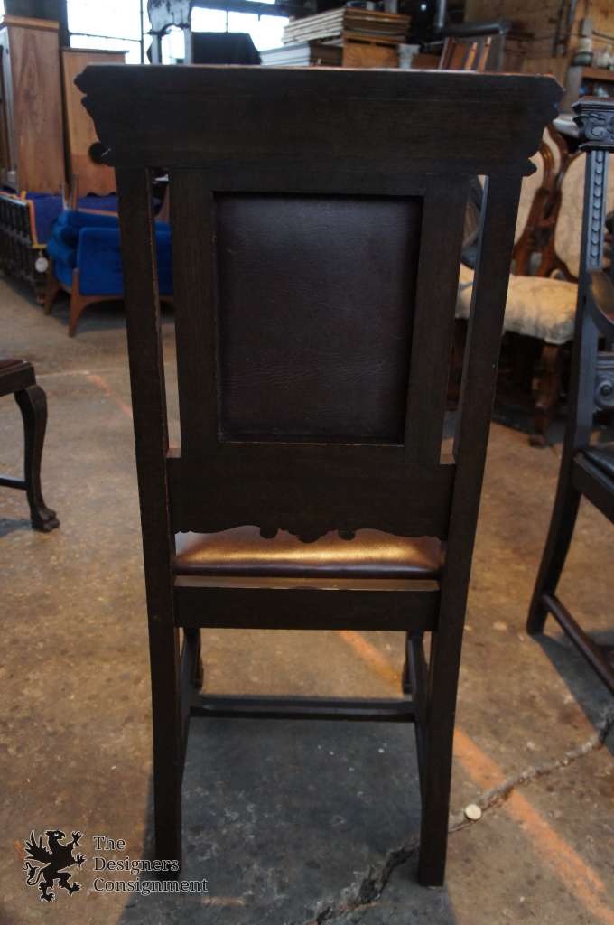 8 Antique 19th C. Quartersawn Oak Gothic Revival Dining Chairs Leather Jacobean