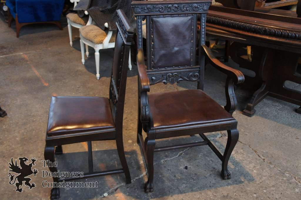 Beautiful set of 8 Gothic chairs. Made from quartersawn oak, circa 19th century. Each chair features floral scrolled carving along the upper and lower back with a scalloped accent. Seat back is leather with brass nail head trim. Legs show a slight cabriole shape leading to paw feet. Each leg is joined by a stretcher from front to back, and those are joined by a centrally located stretcher for added support. There are 2 arms chairs that are slightly larger then the sides. Each arm has a grooved accent towards the front, and acanthus carved portion leading to the seat.