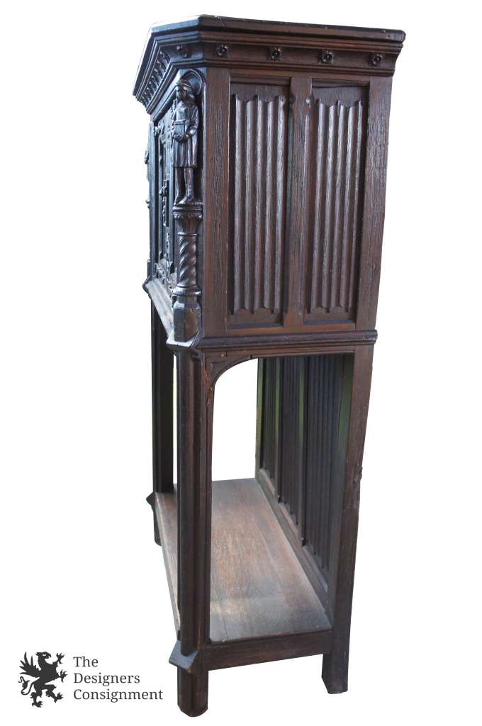 Antique 19th Century Gothic Vestment/ Linen Cabinet or Cupboard. Made from Oak with exquisitely carved high relief peasant figures along the doors and corners. Panels are fluted. Hardware is Cast Iron. A magnificent addition to any setting.