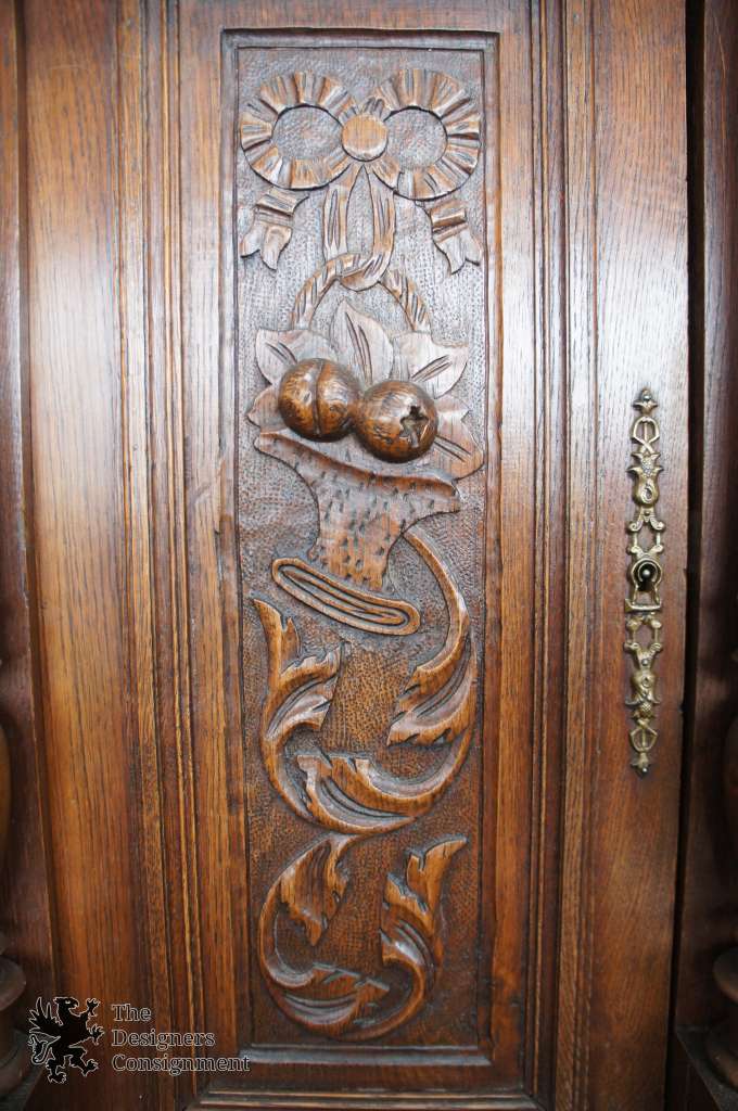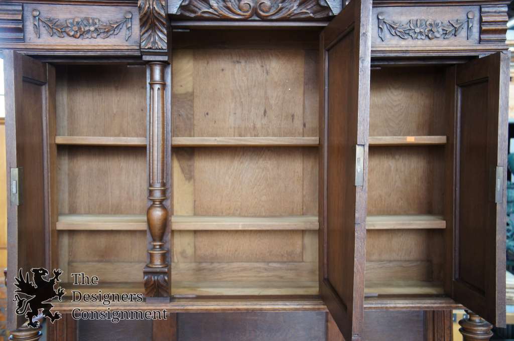 A gorgeous Oak sideboard server with upper cabinet. Meticulously carved in high relief with a dragon panel at the center door. Both upper and lower cabinet have shelves for storage. Doors are locking. A great bar back or server for any setting.