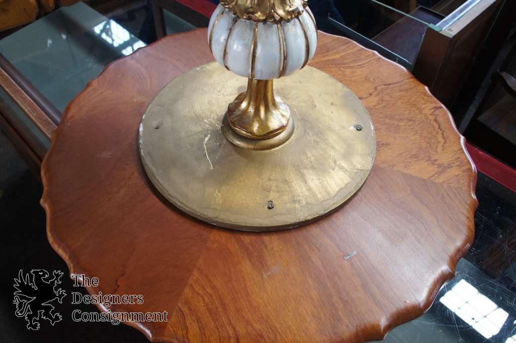 A gorgeous Florentine Coffee/ Cocktail table. Features a white and gold bulbous pedestal base leading to a beautifully scalloped top. Table is marked made in Italy along the bottom. A fantastic addition to any setting. Depending on your location we can ship this piece out via UPS as the top removes from the base.