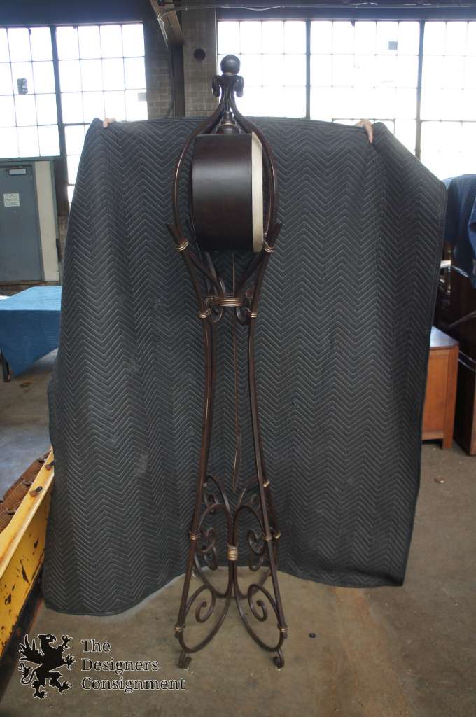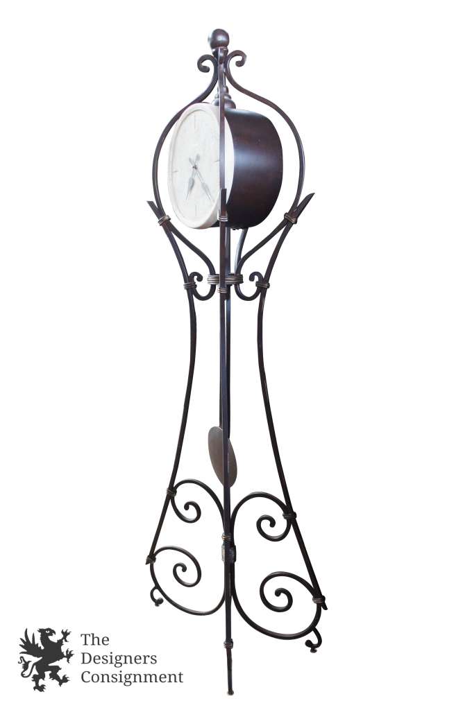 Beautifully designed iron work creates the foundation for this floor clock which features a cast stone dial.