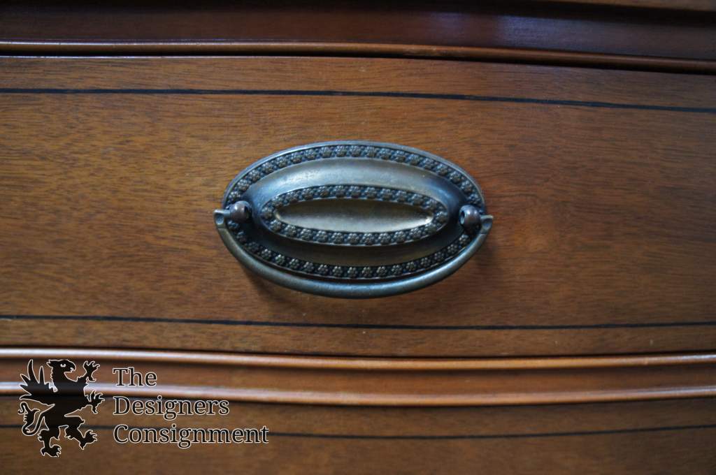 Mid Century Sheraton Style dresser by Henredon. Features a serpentine front with a dark inlay to frame each drawer and the top. Mirror hangs on its own. Marked no.3500