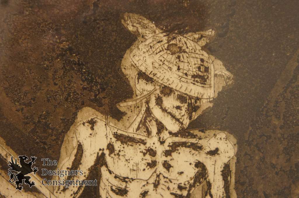 An intriguing day of the dead themed art. Features a skeleton with Spear. Titled "Fin" or End in Spanish. Signed by artist 1967, and marked 1968 on the rear to denote when it was framed. A great addition to any collection.