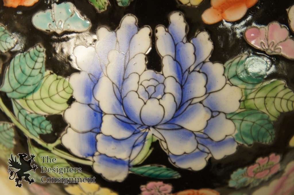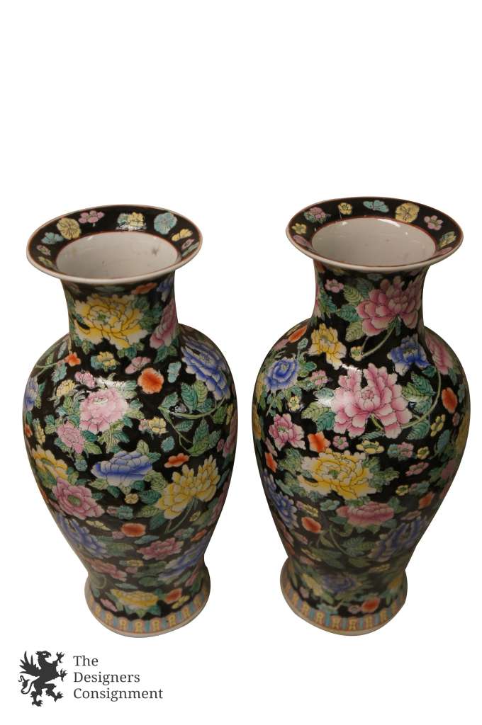 A beautifullydecoratedpair of Chinese vases. Black base color covered in vibrant flowers. Each vase is stamped along the bottom
