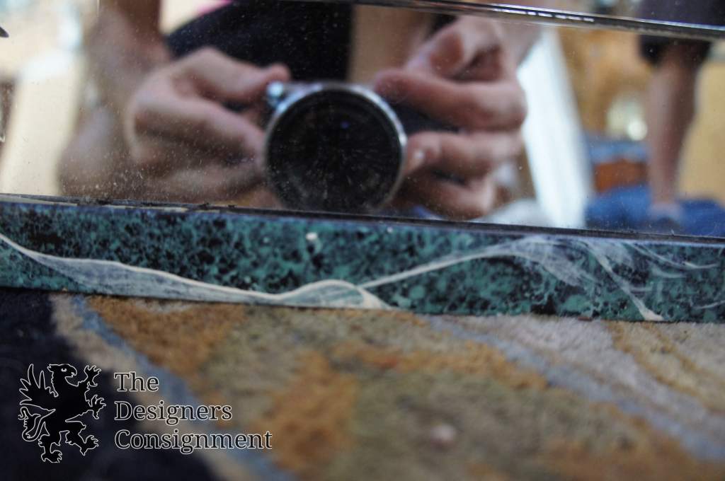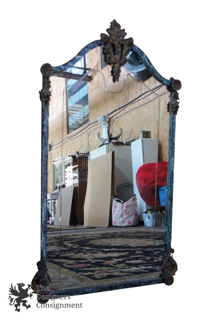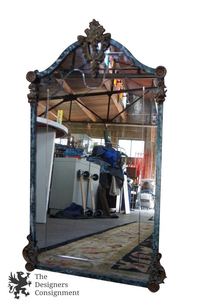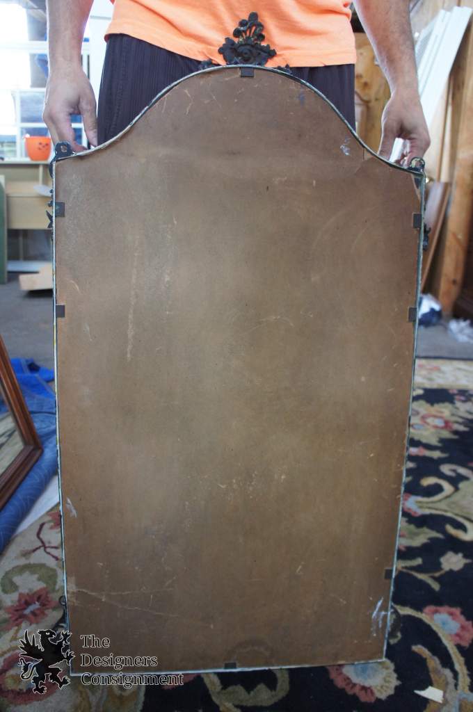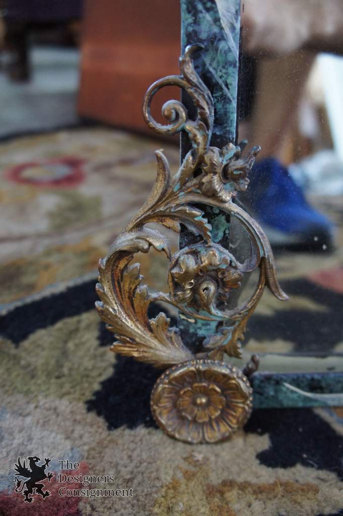 A beautifully designed mirror. Features a metal frame with gilt bronze medallions and floral trim. The mirror itself is engraved with a border or trim that frames it neatly. A nicely weighted piece that will look great in any setting.