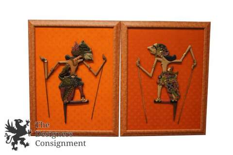 Wayang is a Javanese word for a theatrical performance with puppets or human dancers. An art form that dates back to the first century CE when Buddhismwas brought to Southern Asia. This pairing are mounted onto an orange linen backing with a light wood frame. The puppets are crafted from wood with articulated arms. Each figure is remarkable in detail. A fun pair for any setting.