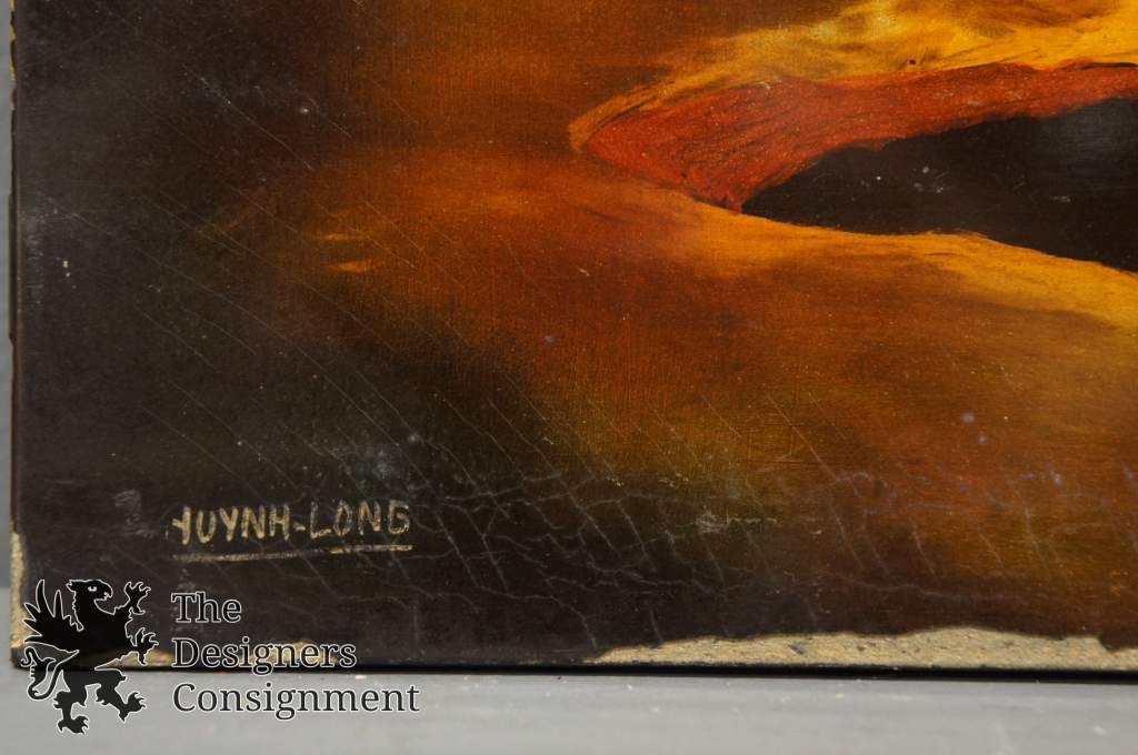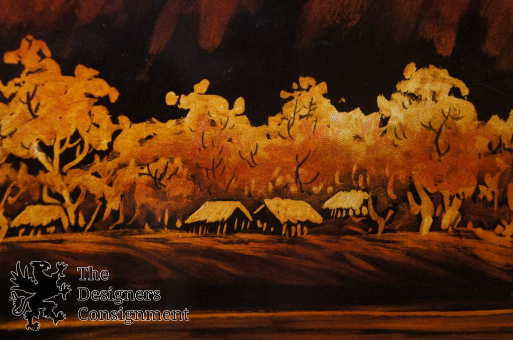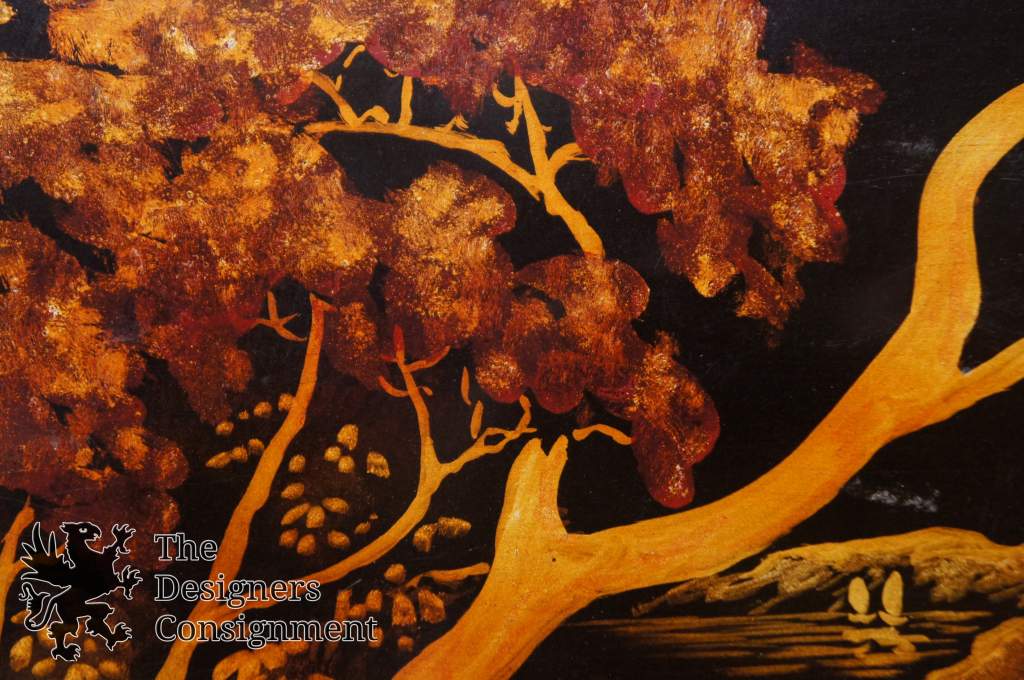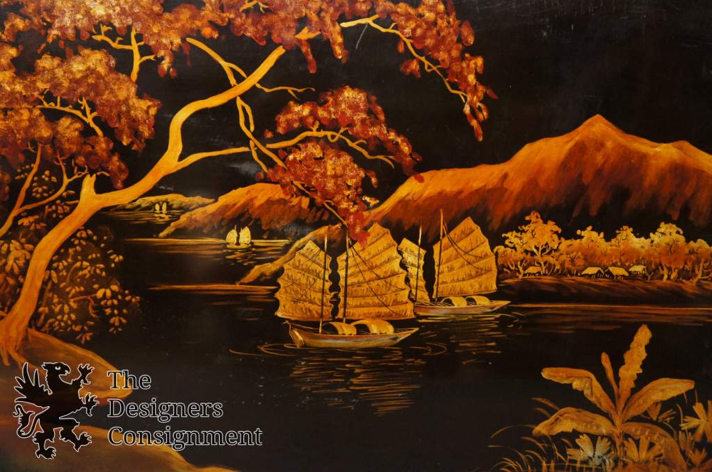 A beautiful lacquered panel. Features a river scene with boats near a village. Dark with a golden color. Signed on the bottom left.