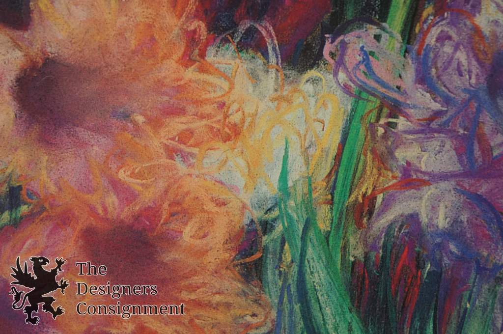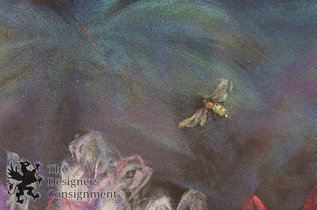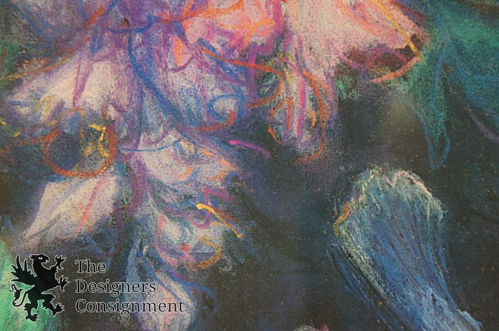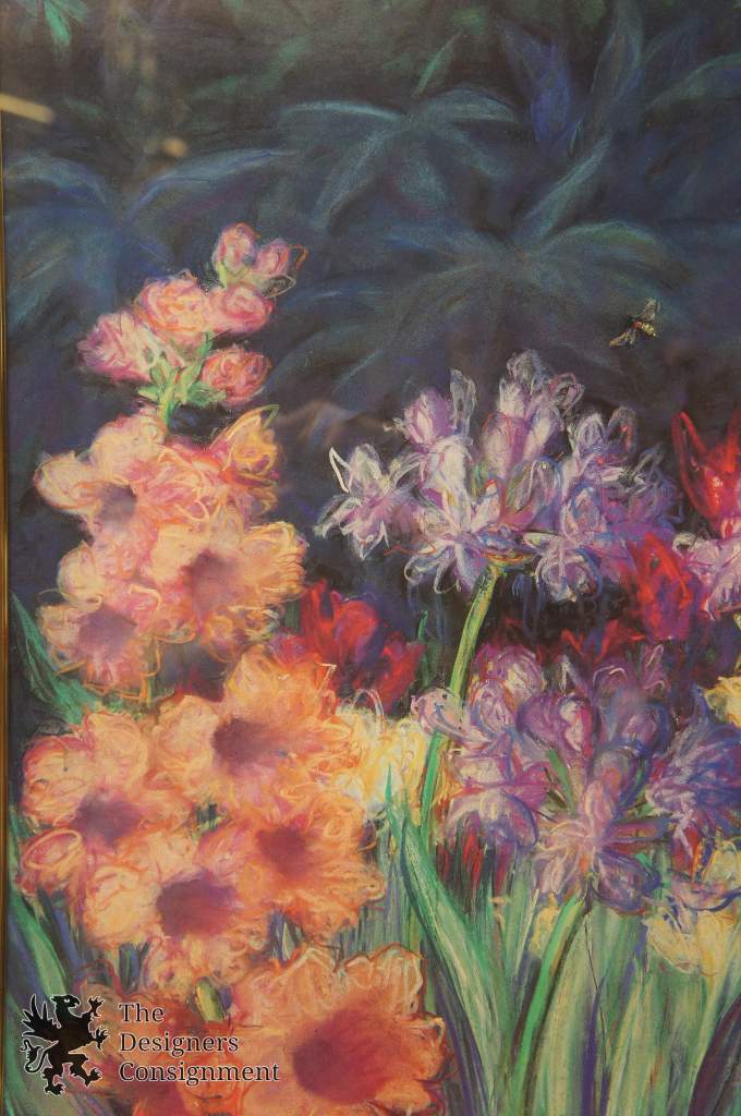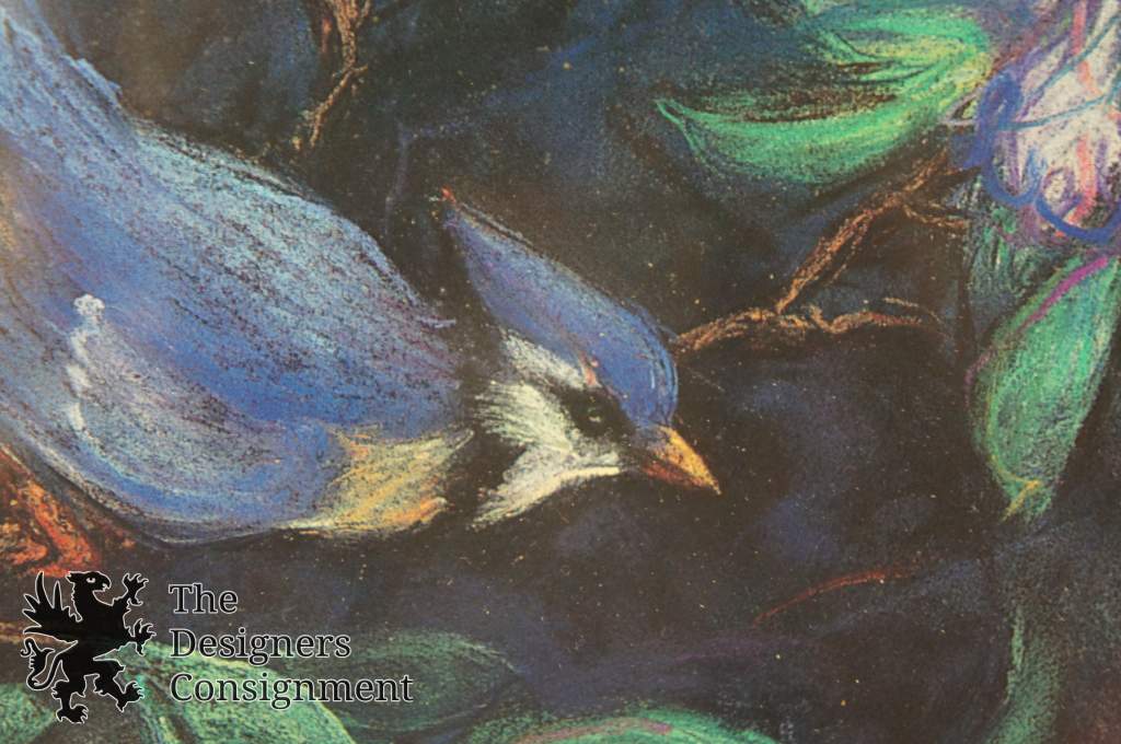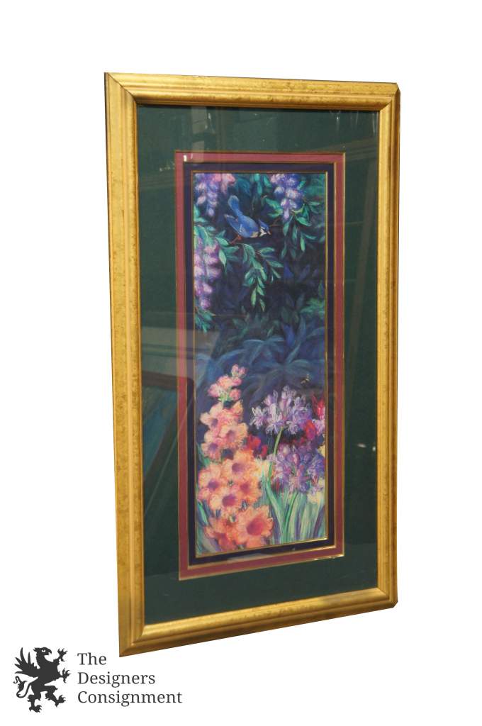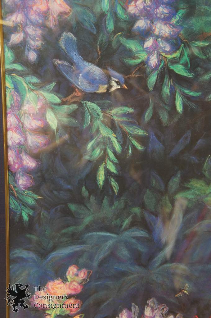 A stunning landscape in a botanical setting with a blue jay amongst flowers.