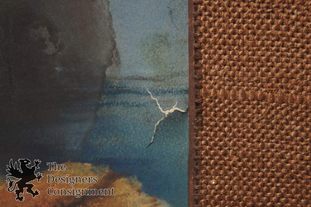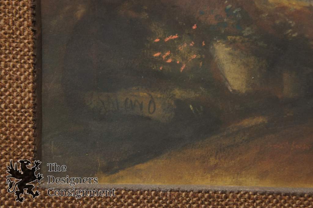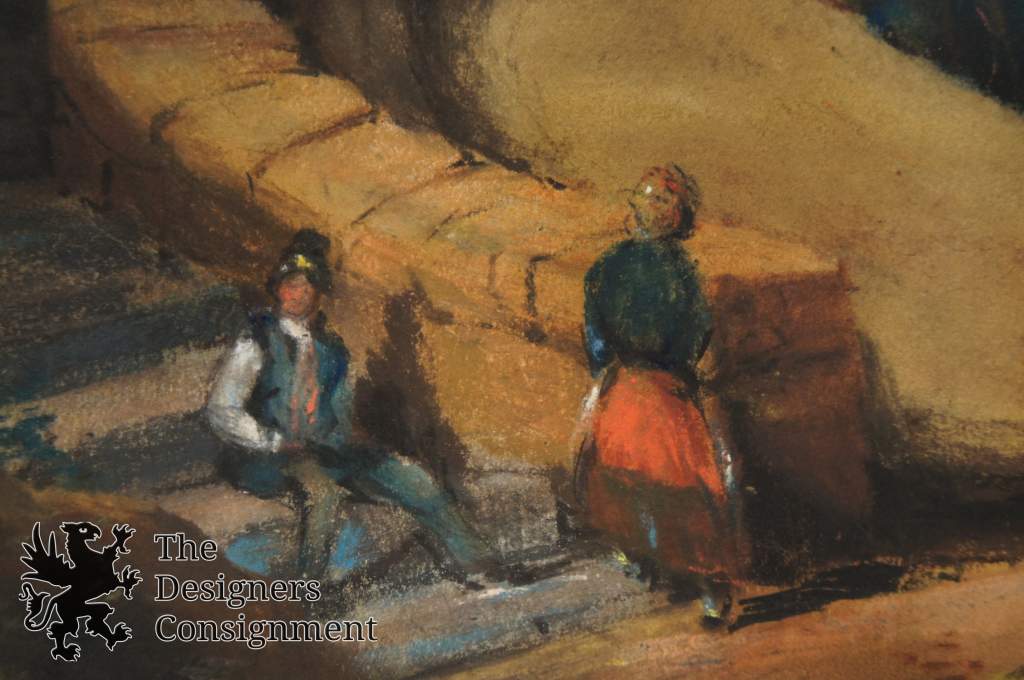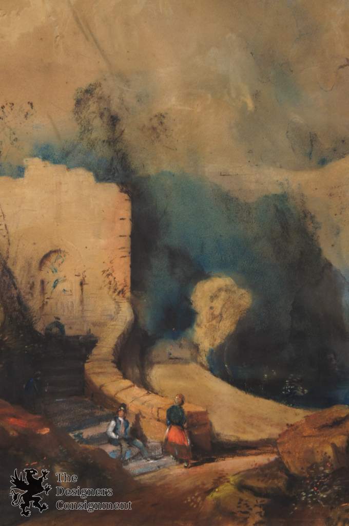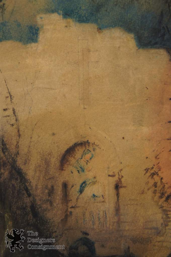 A gorgeous unfinished piece after James Charles Ward a British painter of the middle 19th Century. Murky in color with deep blues and whites. Figures can be seen towards the bottom of the church stairs along a country road.