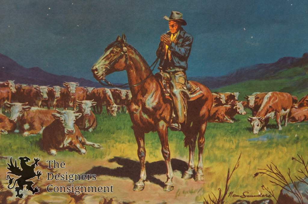 Lithograph Print Norm Saunders Cowboy Horseback Night Cigarette Cattle Western