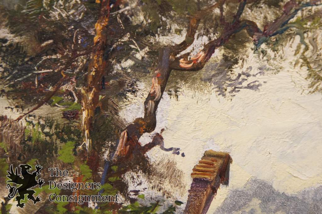 Hungarian Landscape and genre painter. Active in Munich. Featured is a mountain landscape. A woman can be seen walking down the pathway next to a large bird feeder. Signed along the bottom left, and framed.