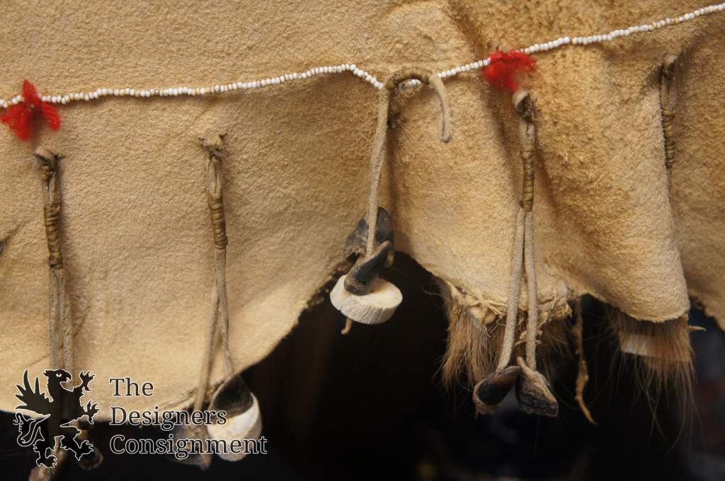 A beautifully painted Native American buffalo hide. Made with hand dyes and beaded accents. Features 8 war horse and their tribesman along the top, and 9 rows of beads along the bottom. Each row has 8 red points on it. I am not sure of the symbolism, however they are clearly intertwined. The hide has a heavy iron bracket along the backside allowing it to be hung along the wall for display.