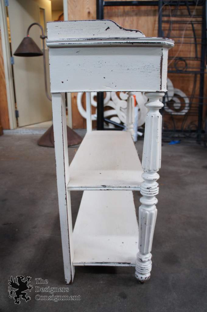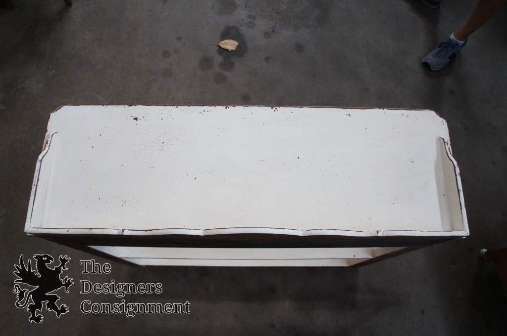 A beautiful 1850s buffet. Painted in a distressed White Chic finish. Primitive styling with 2 lower shelves in addition to hand dove-tailed drawers. The drawers feature a central locking mechanism that seals both shut.