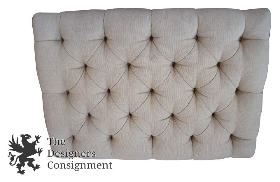 Gorgeous designer tufted ottoman. The tag was removed upon re-upholstery, but most likely Willams Sonoma or Ralph Lauren. Distressed with turned legs and brass nail head trim. A great addition to any sitting area.