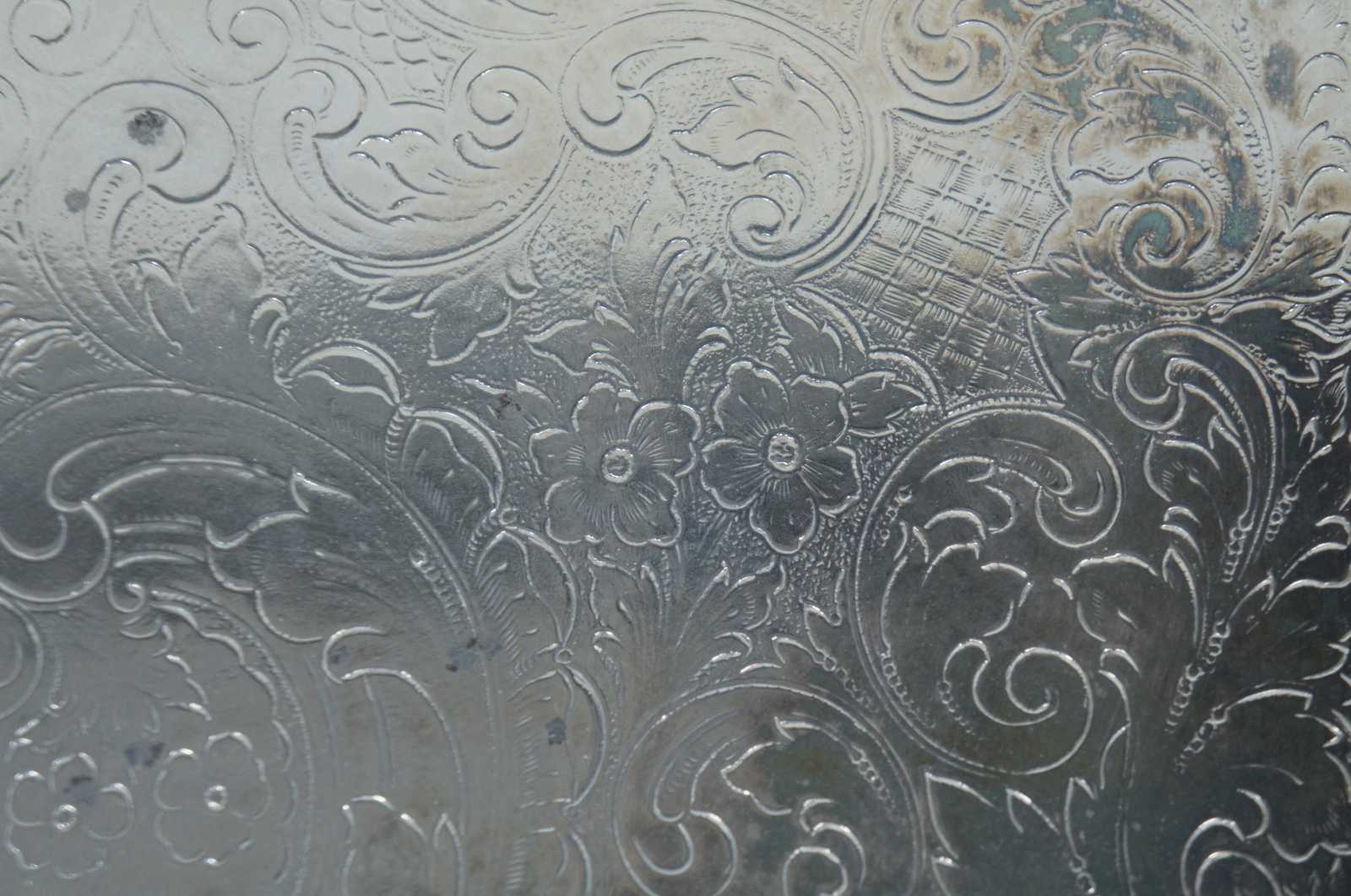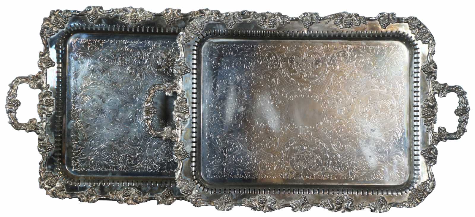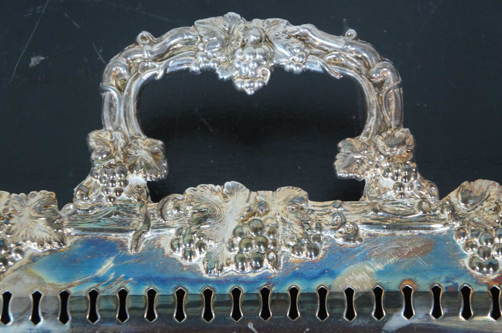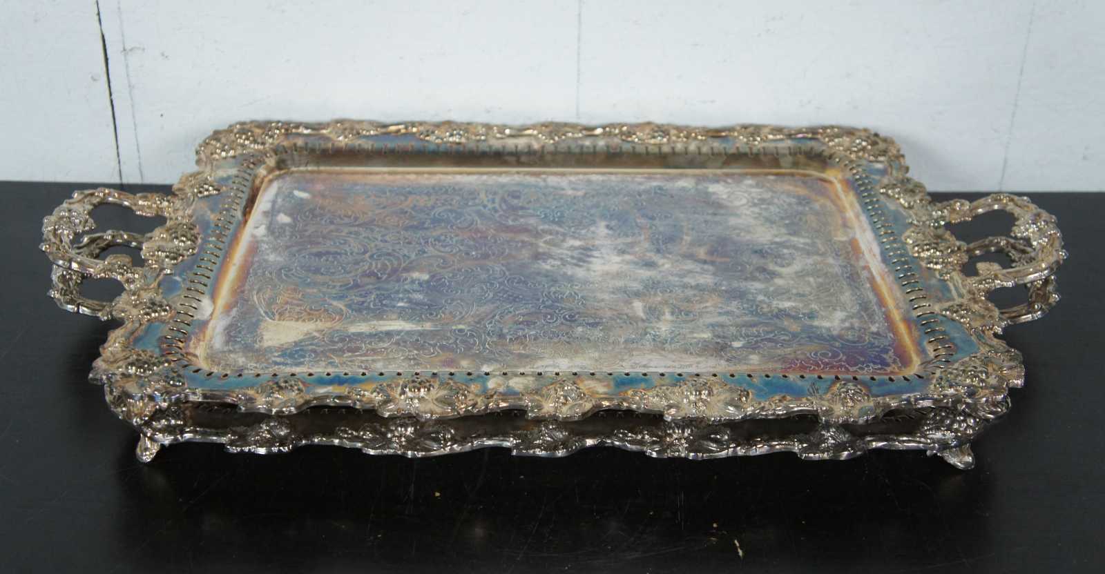 Extra large Birmingham Silver Company silverplated (silver on copper) butler tea tray or serving platter. Circa 1960s Features a scalloped floral and grape vine design with an engraved floral surface, reticulated border with handles and footed base. Two available, sold separately.