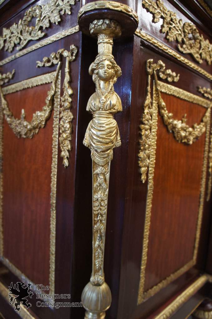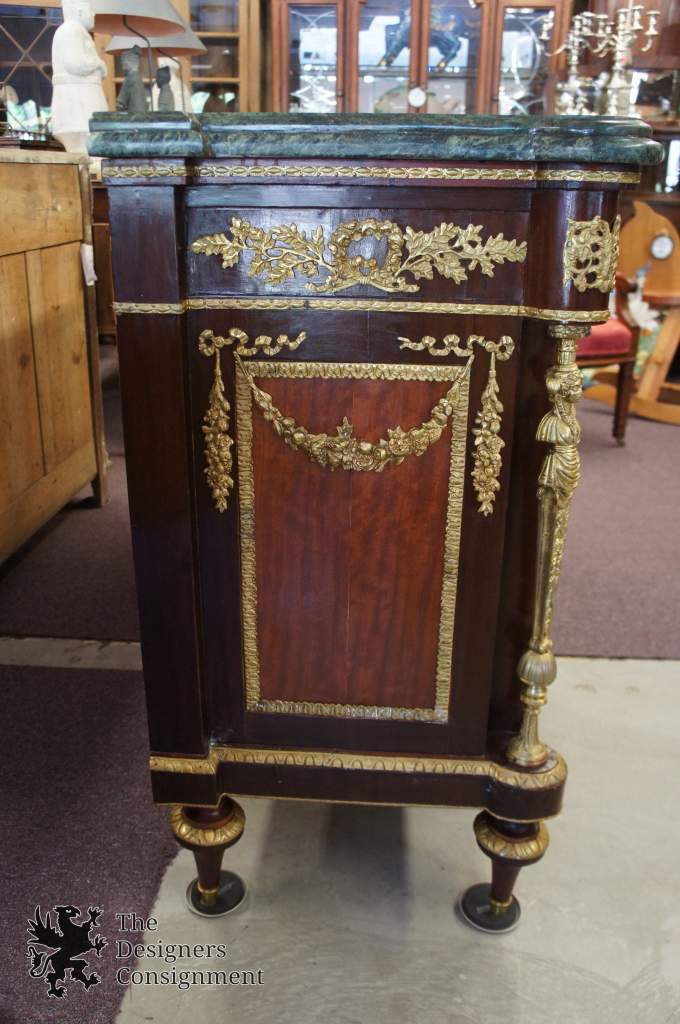 Circa 1920's French Breakfront. Made from Mahogany with with Gilt Bronze accents and a thick Marble top. Baroque styling throughout with ornate trim and detailed figures along the sides. The green marble is 2" thick with an exquisite cut. Sits on 6 hand turned tapering legs. A fantastic piece that will add grandeur to any space.
