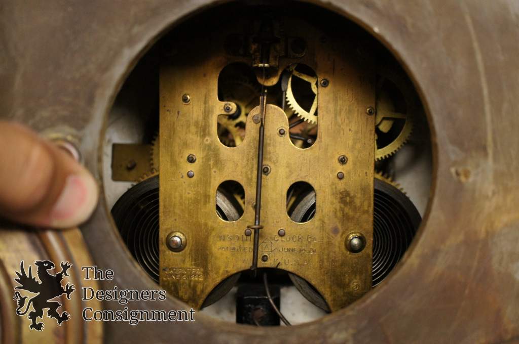Antique Ansonia Mantel Clock. Founded in 1850, Ansonia was a prolific American Clock Manufacturer that peaked around 1914 before selling to a Russia company in 1929. This clock which was made in the 1880s is set in Green Onyx stone with a classical vaulted top and gilt bronze accents. The face is gilt with roman numerals and escapement along the outside. The perfect color that will add grandeur to any space.