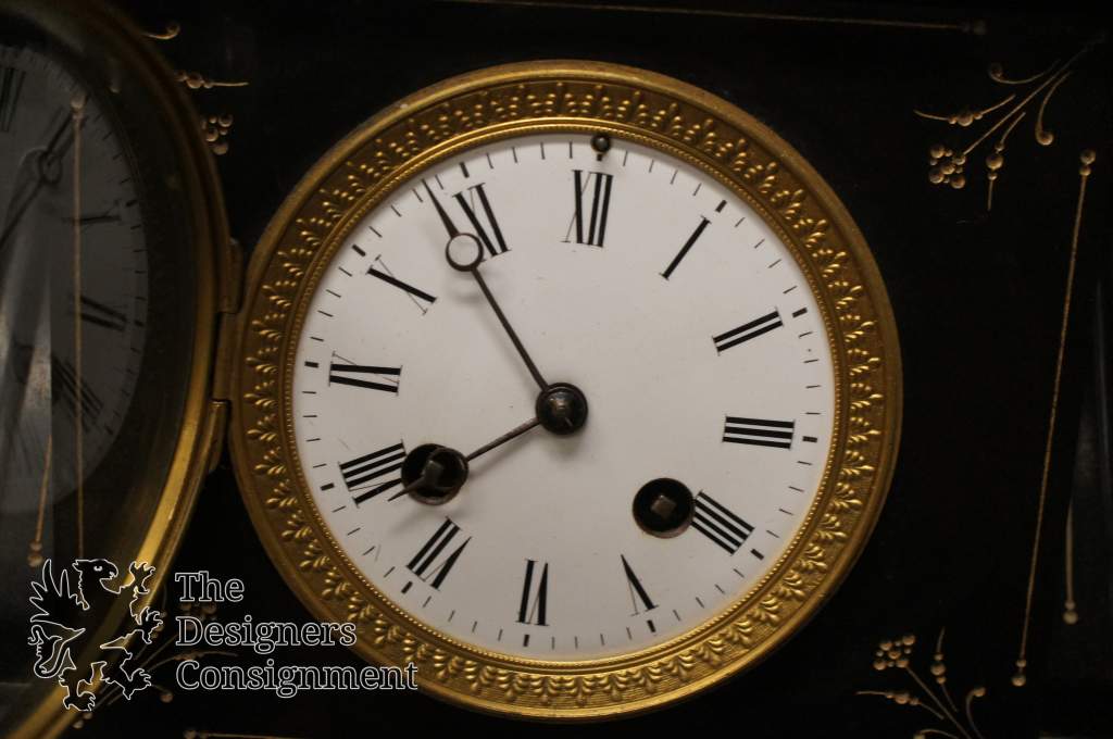 Good Working Condition - Pendulum repaired at some point. Top Spelter a bit loose. A piece of the slab repaired in the past, and some chips.