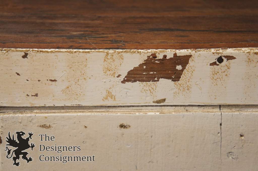 Good Antique Condition - The cabinet has a distressed top showing some marking and stains. The body was painted white at a later day. Lowe back right side panel has been chipped off at some point in the past. Can be seen in the second to last photo. Casters also added towards the middle of the century