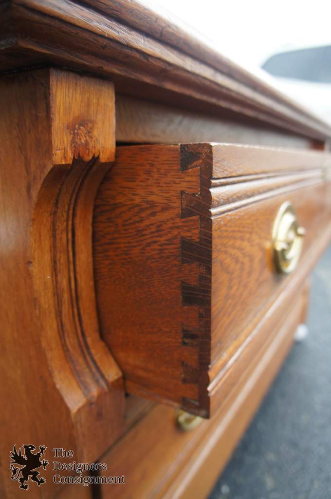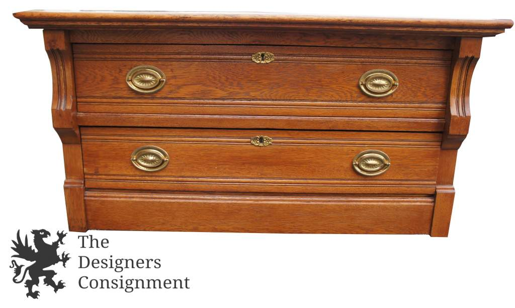 Primitivestyle 2 drawer oak dresser with brass hardware and castors.