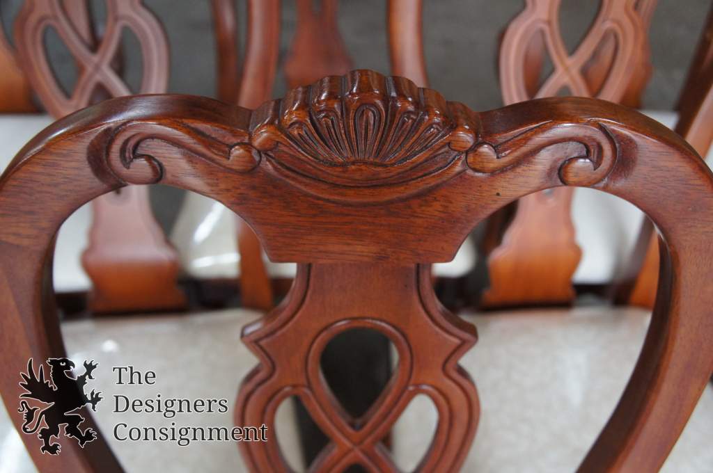 6 Chippendale style Mahogany Dining Chairs. Complete with pierced back with scalloped top and cabriole legs. Upholstered in a white floral. 4 of the seats have theoriginalplastic still on them from the manufacturer.