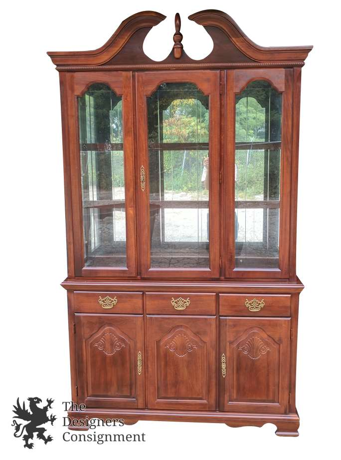 Queen Anne China Cabinet with illuminated top. Mahogany finish with solid brass hardware. Open pediment top.