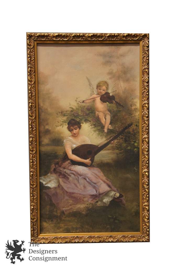 Beautiful early 20th Century Classical Oil Painting. Featured is a woman playing her lute in the woods with a cherub over her shoulder playing the violin. The painting is unsigned. Framed is newer.