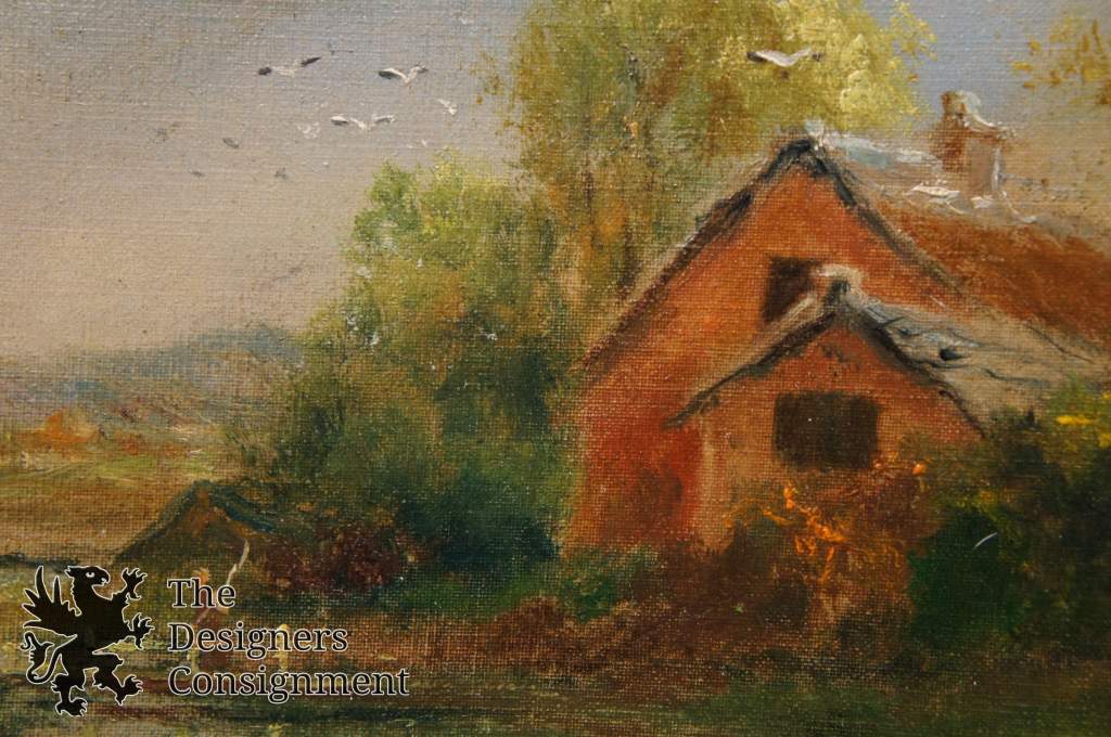 A beautiful oil painting. Appears to beearly20th century on are-stretchedsub frame. Features a farm setting with ducks on the pond.