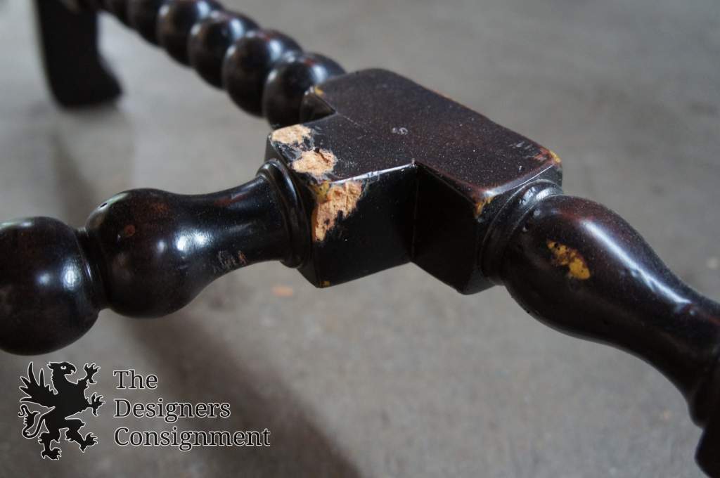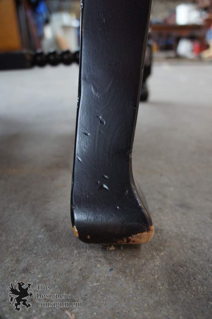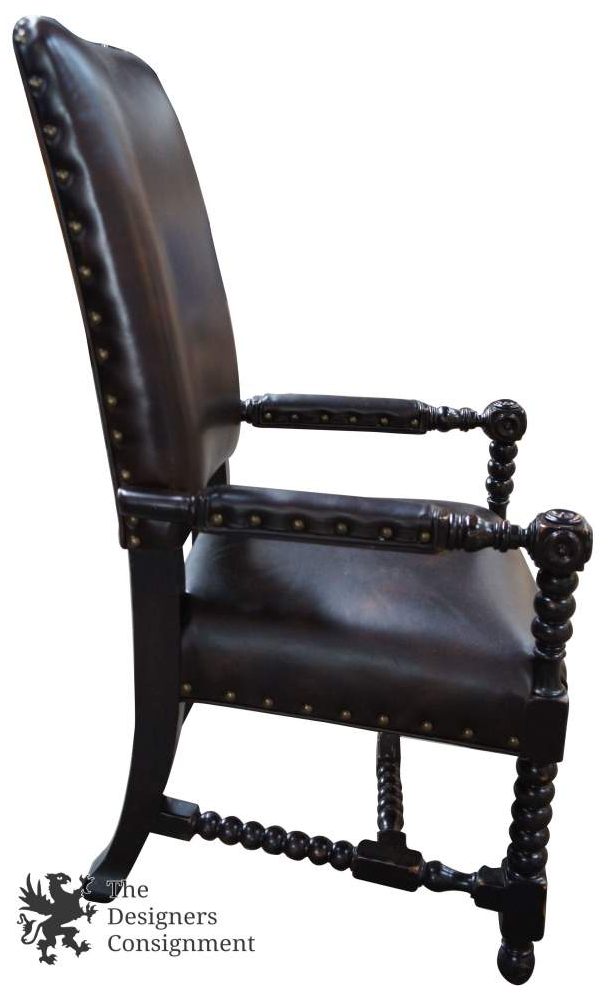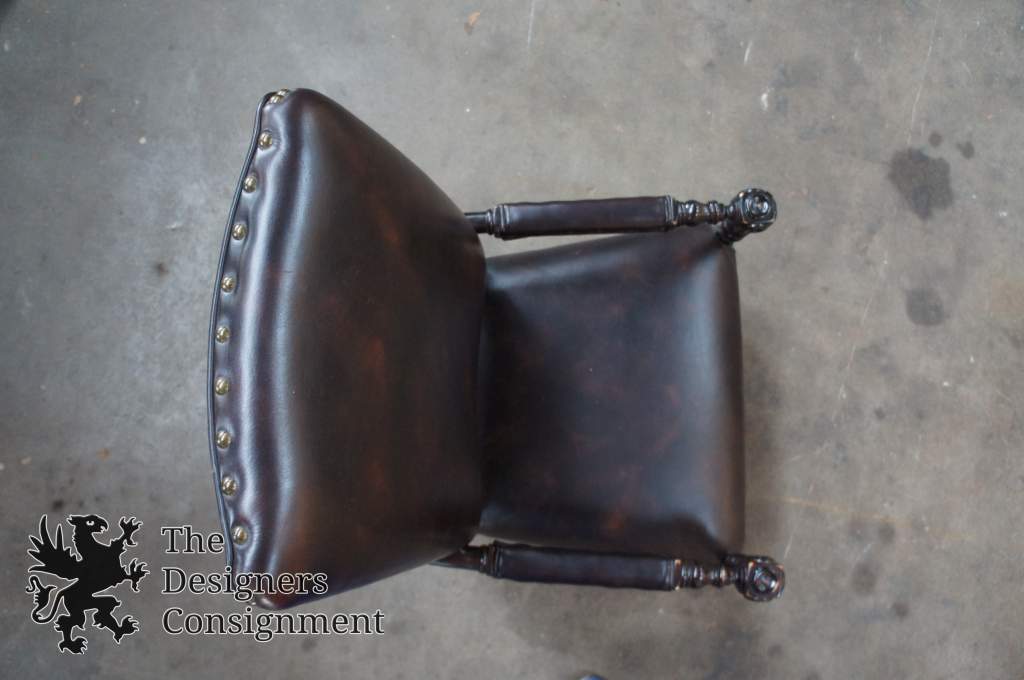 Beautifully contoured chair with dark wood and carved detail. Upholstered in a deep brown leather with nail head trim.