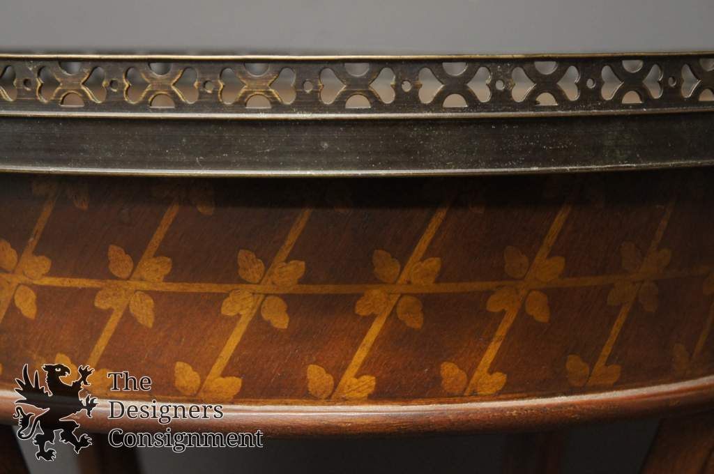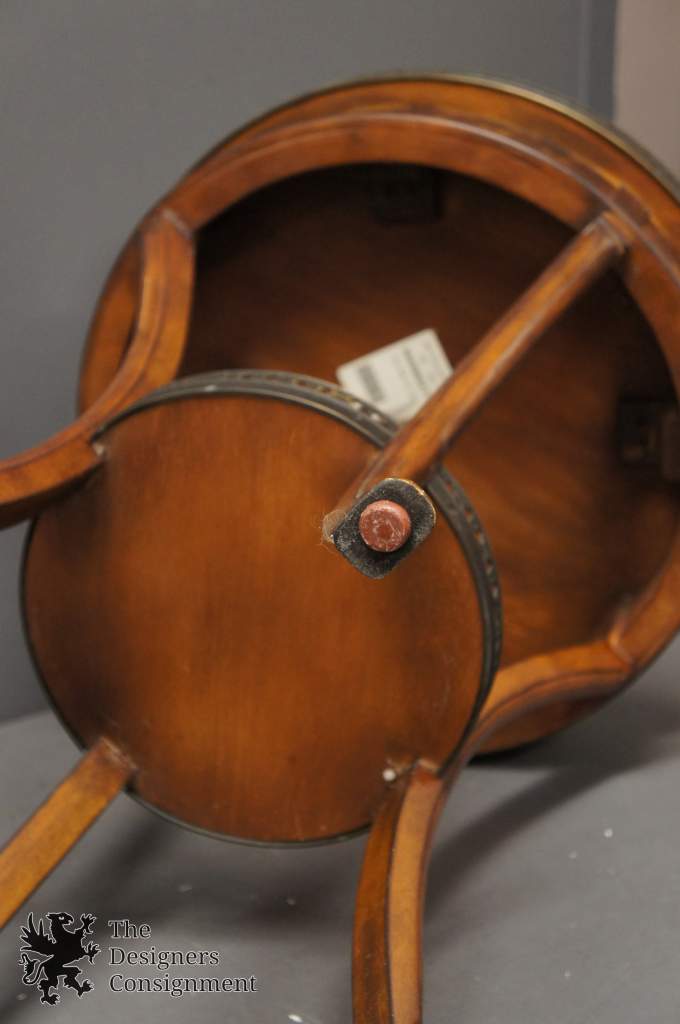 Beautifully designed 2 tier table in a medium wood tone (brown) with gold diamond painted pattern. Each tier features a pierced brass trim. French styling with carved feet.