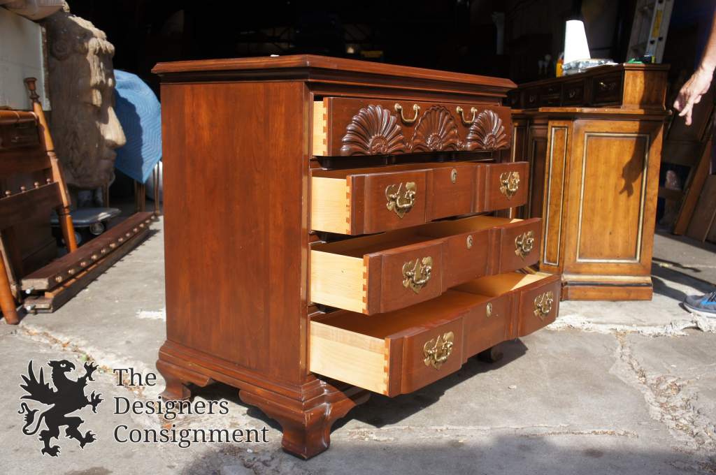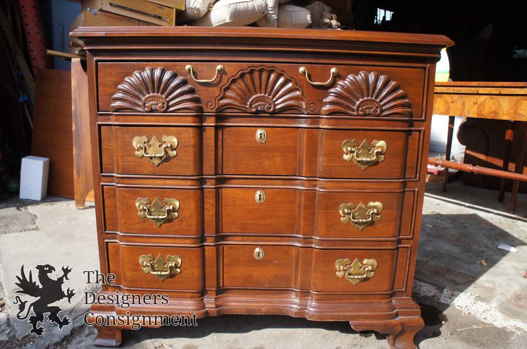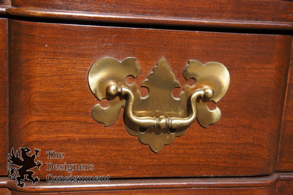 A [Colonial Revival] block front (bachelors) chest, Mahogany with shell carved top drawer over three drawers with bail handles
