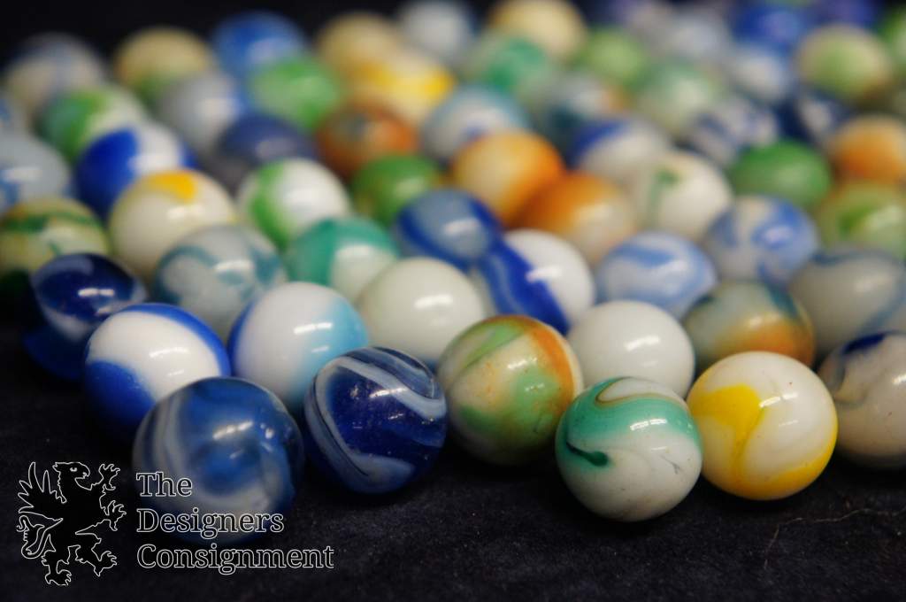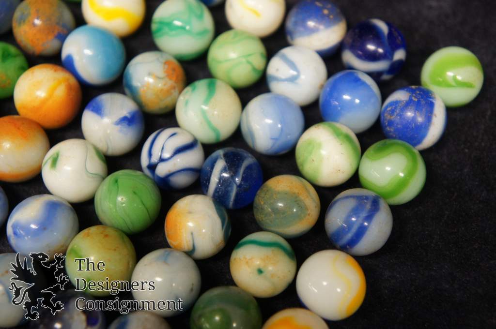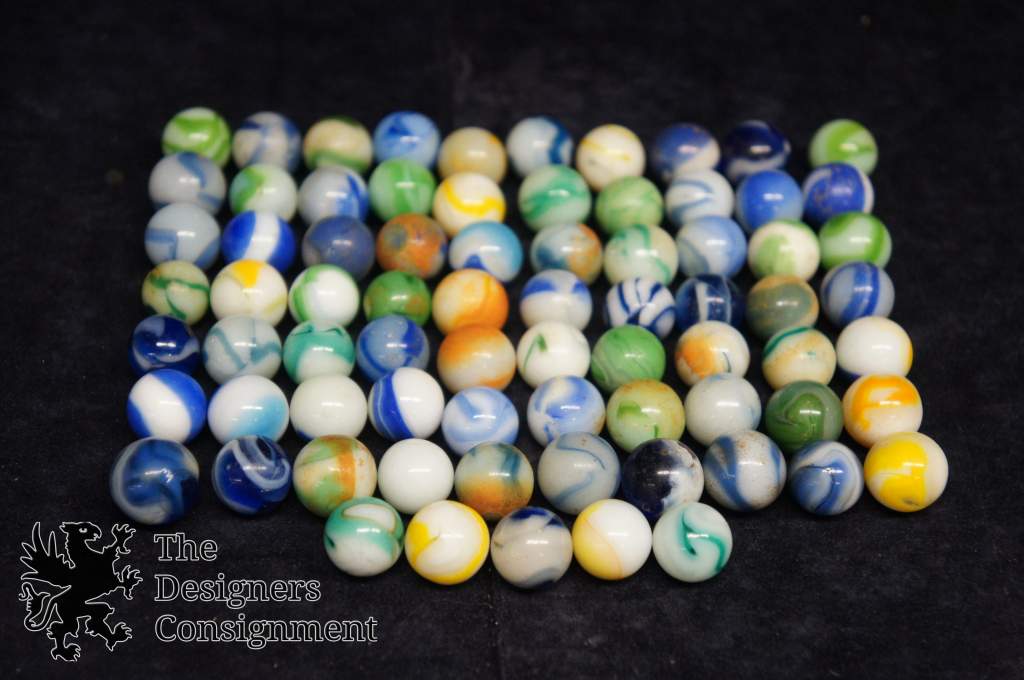 75 Vintage Machine Made Yellow Green Blue White Opaque Swirl Glass Marbles Toys