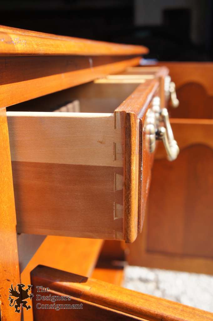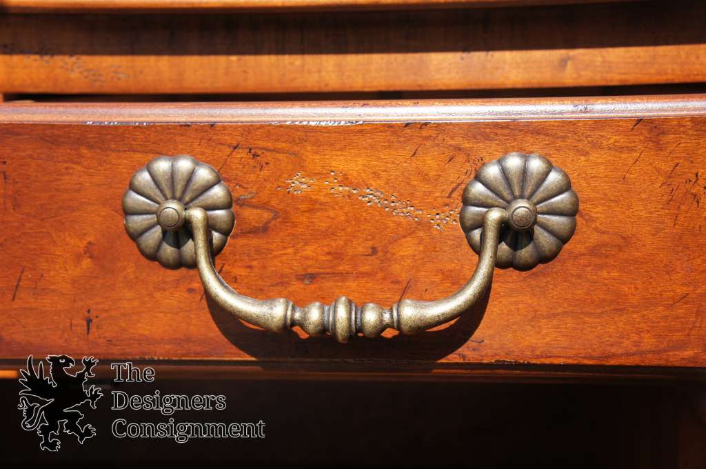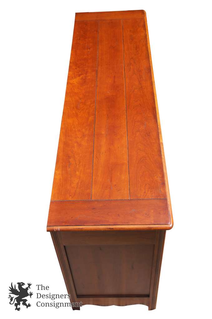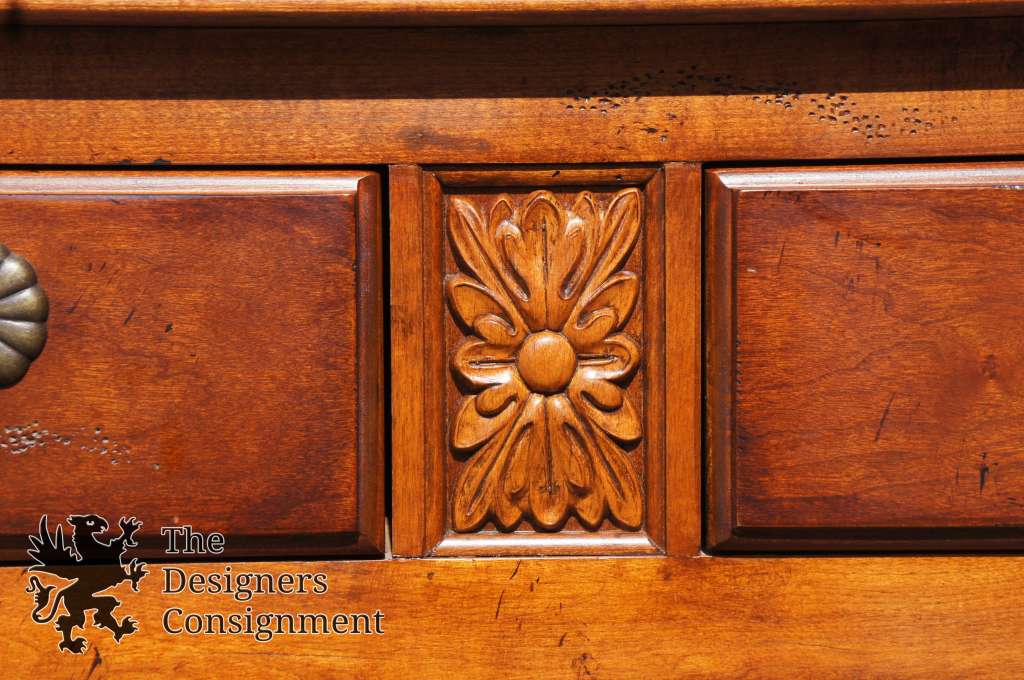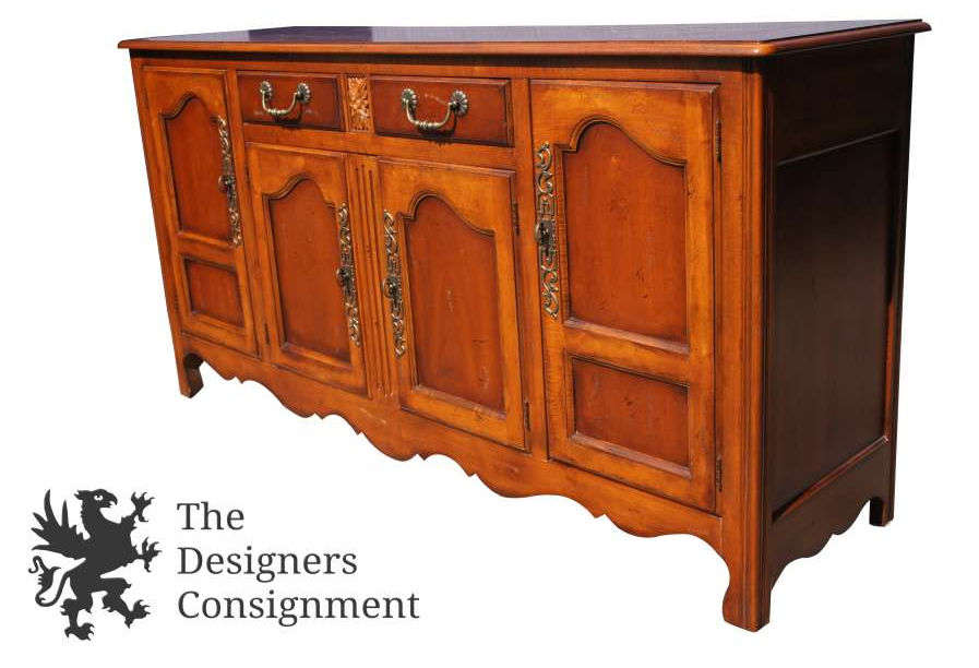 This exquisite buffet is made from cherry with a distressed finish. Scalloped trim and an ornamental brass hardware. With plenty of storage space it is great for formal occasions.
