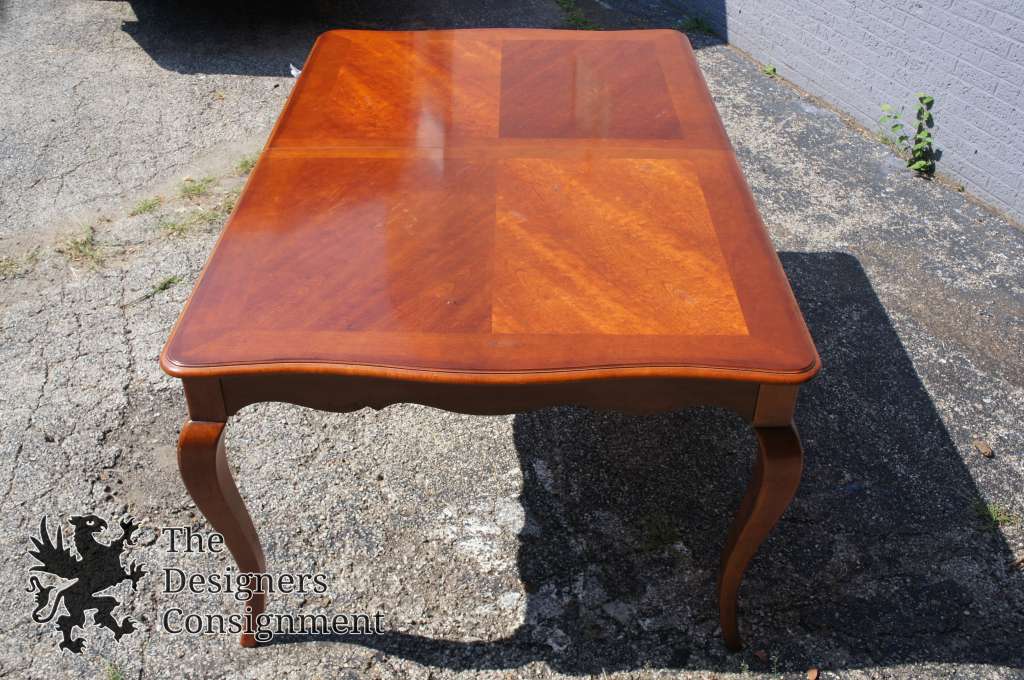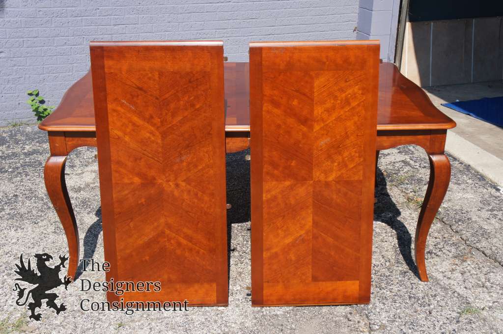 An elegant French Country dining table by Hickory White. Hand crafted in North Carolina with beautiful color and detail. Features a scalloped apron and cabriole legs. Legs are removable for ease of movement. Comes with one 20" leaf.