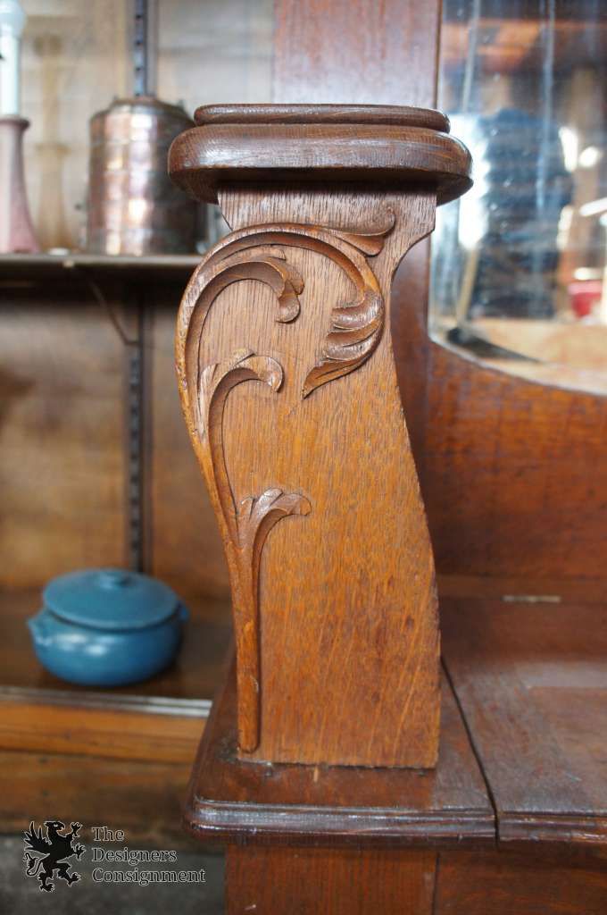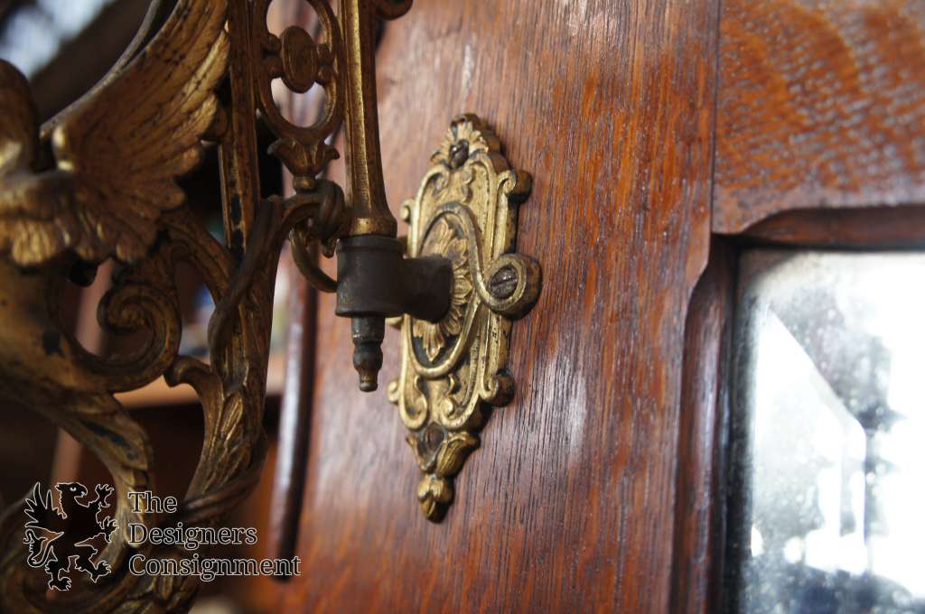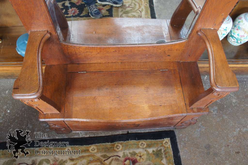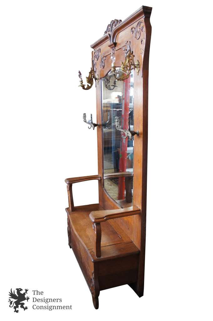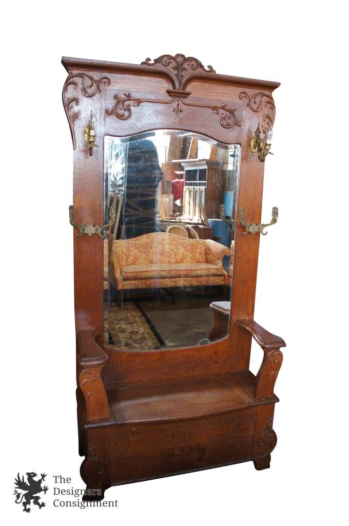A beautiful early 20th Century quartersawn Oak hall tree. Features a wide hinged bench seat with storage below. Along the sides are set of hooks that are topped by illuminated figural sconces featuring a winged female in the nude. The top of the frame shows ornate trim and floral carved detail. The perfect addition to the entryway of any home.