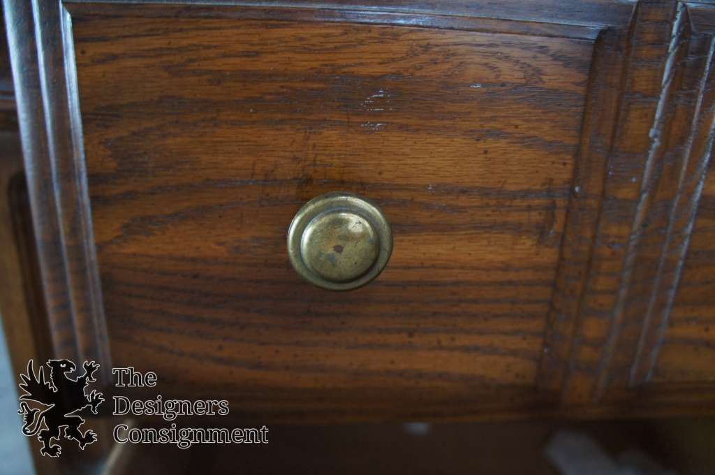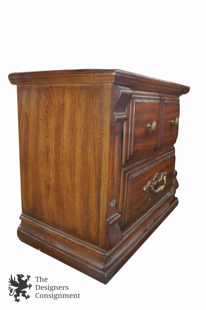 Circa 1980s traditional carved oak end table. Matching bed, and dressers available.