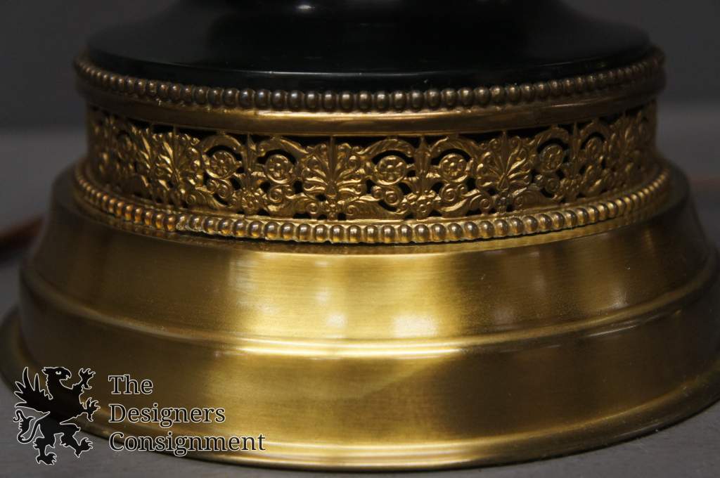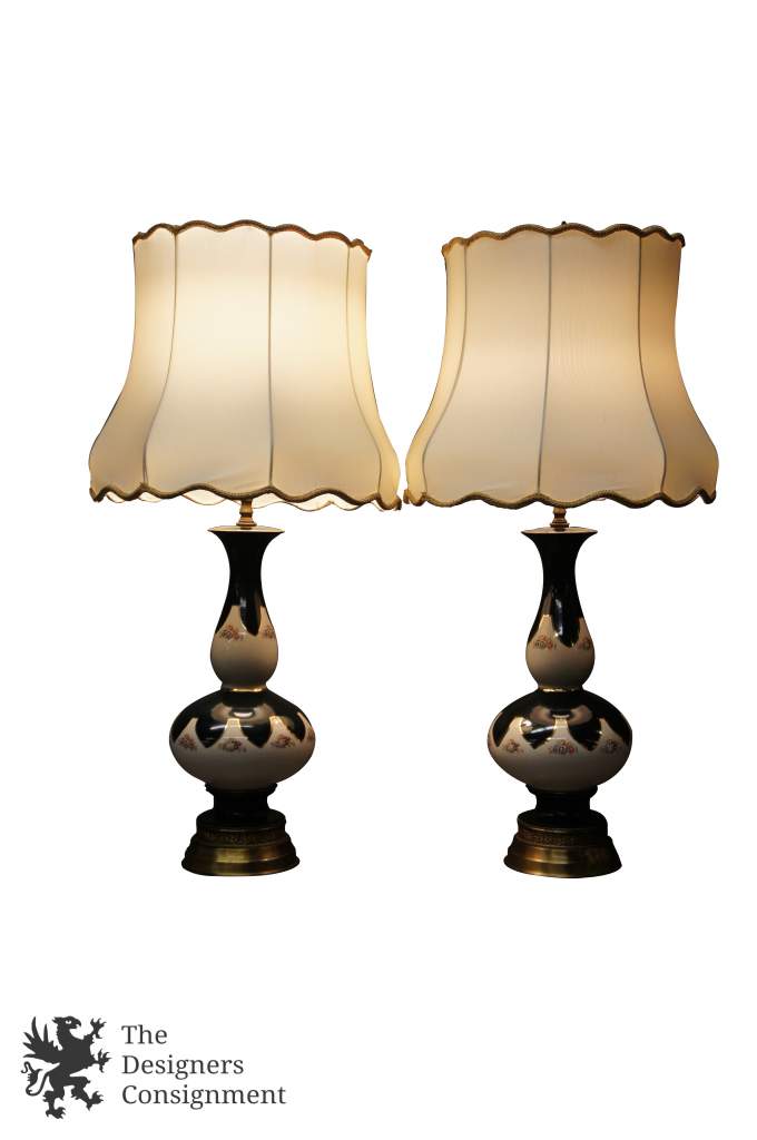 Amazing pair of Mid Century 35" Table Lamps. Green, White & Gold. Made from Porcelain with pierced brass base and upper light fixture. Light is covered by glass torchiere that holdsthe originalbell shaped shades. Rembrandt Masterpieces sticker along the top of the brass fixture. Hand painted flowers and accent trim. An absolutely gorgeous pair for any setting.
