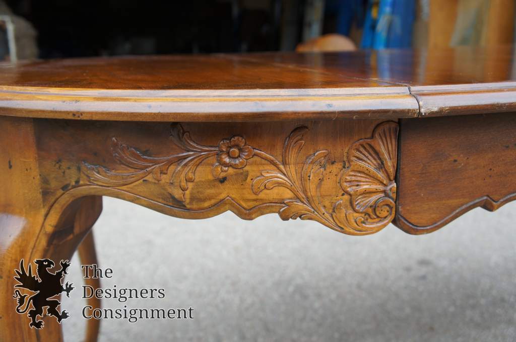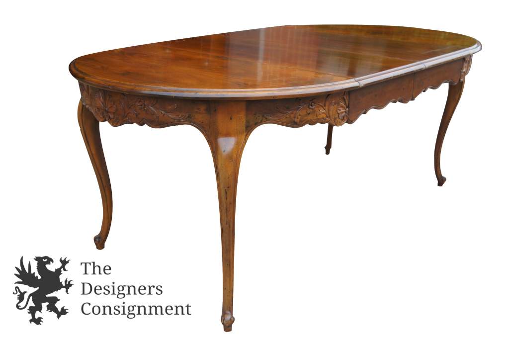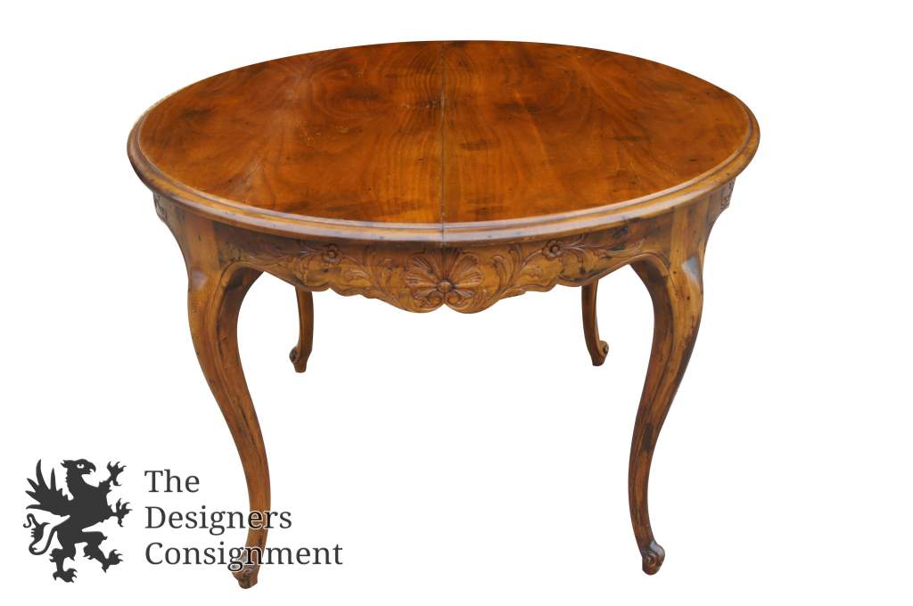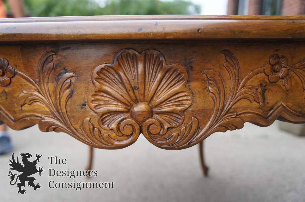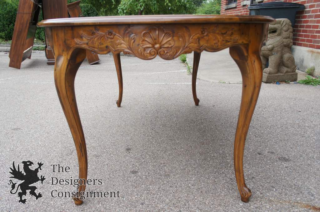 Antique Louis XV/ French Country Carved Dining Table. Made from pine with carved and scalloped accents. Cabriole legs leading to scrolled feet.