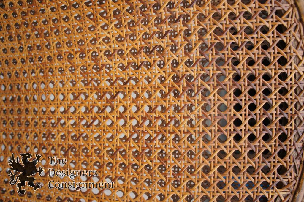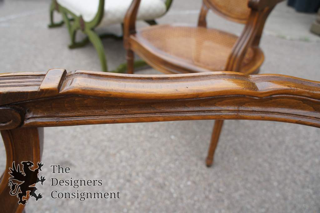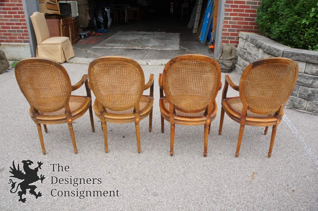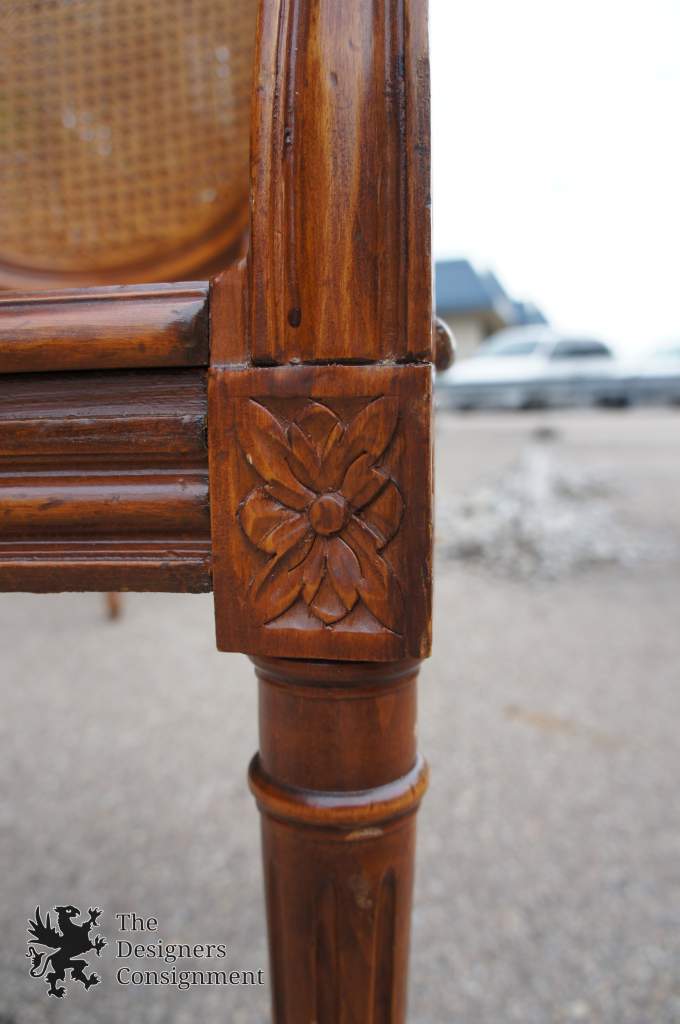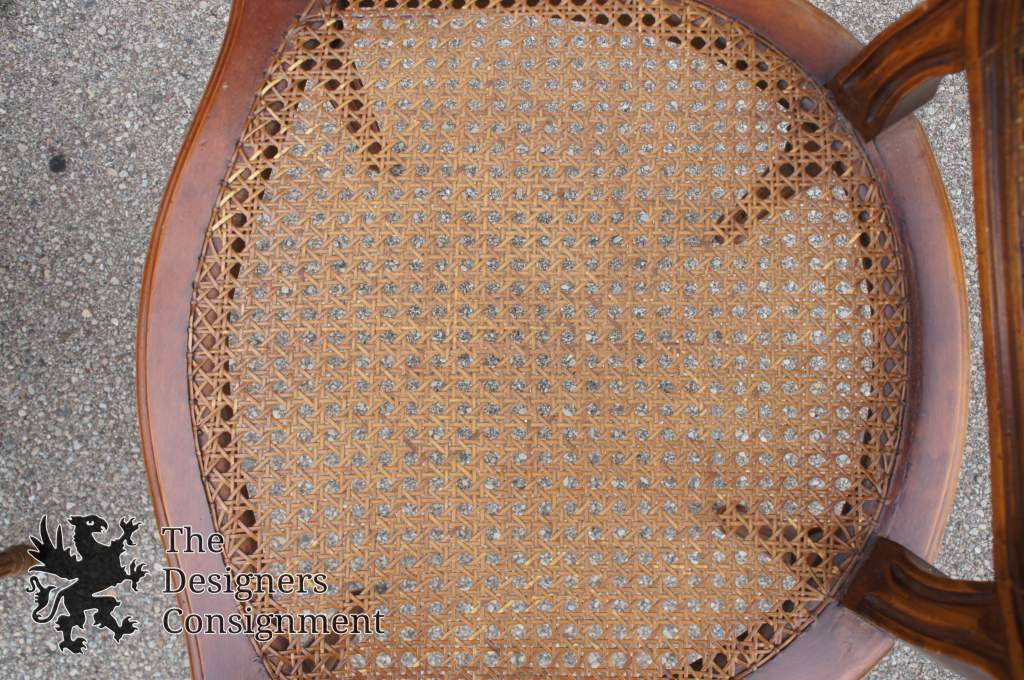 A lovely set of caned balloon back arm chairs with striped cushions. Made fromItalyin a FrenchCountrystyling. Each chair features a cane back and seat in addition to carved accents on the inside of each arm. Fronts of chairs are serpentine with a carved flower on the corner leading to fluted legs.
