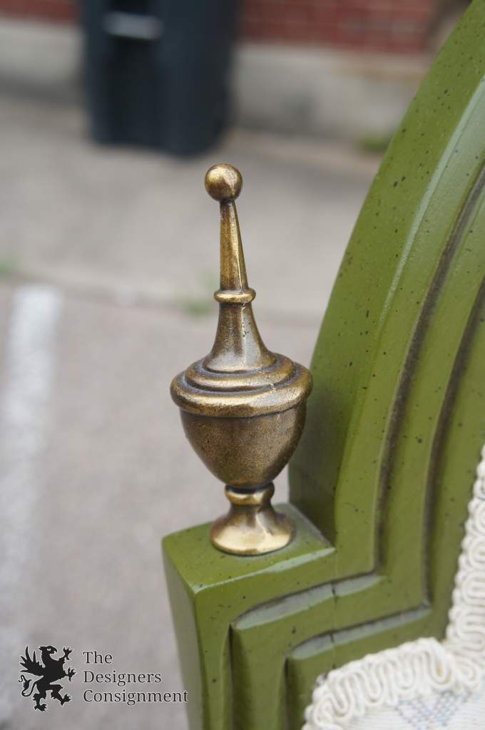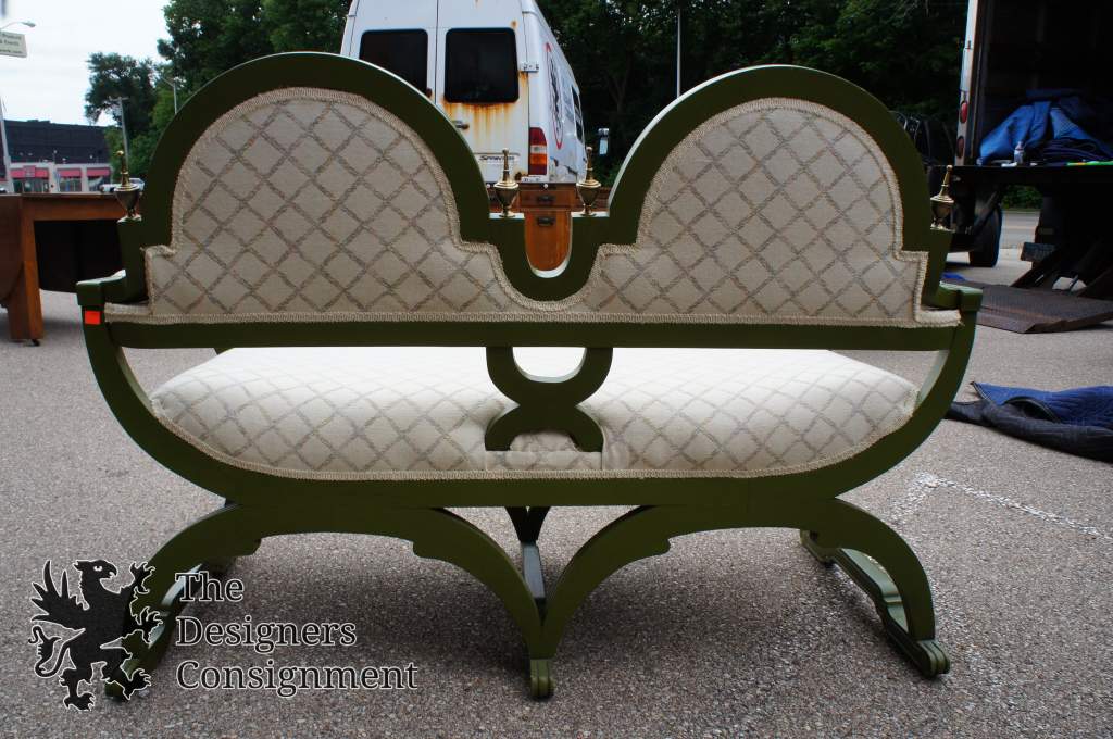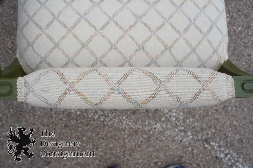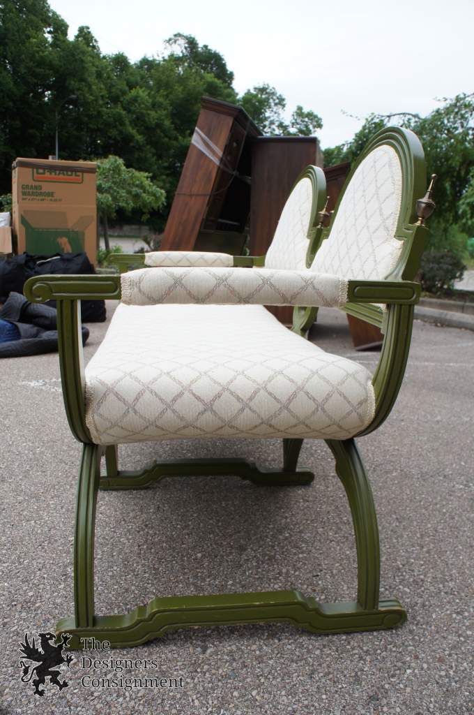 A gorgeous mix of French Renaissance & Traditional styling in this settee. Made from distressed oak. Finished in Green with a diamond striped upholstery. Arched legs and feet with finials along the back andupholsteredarms. Golden carved medallions ordain the front. A great addition to any home.