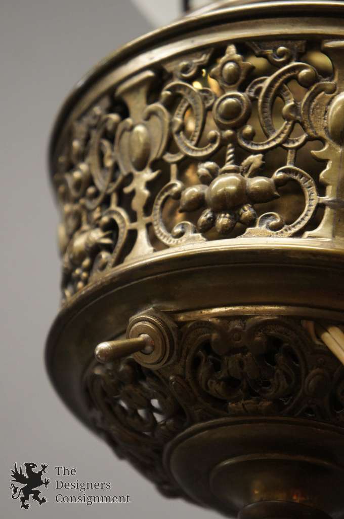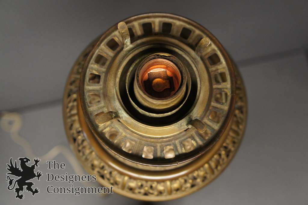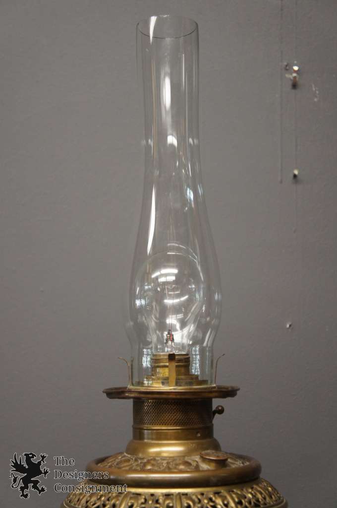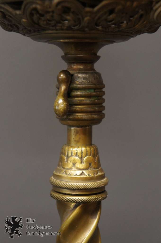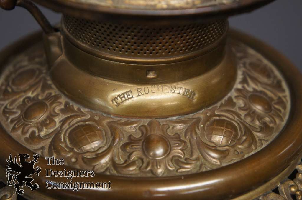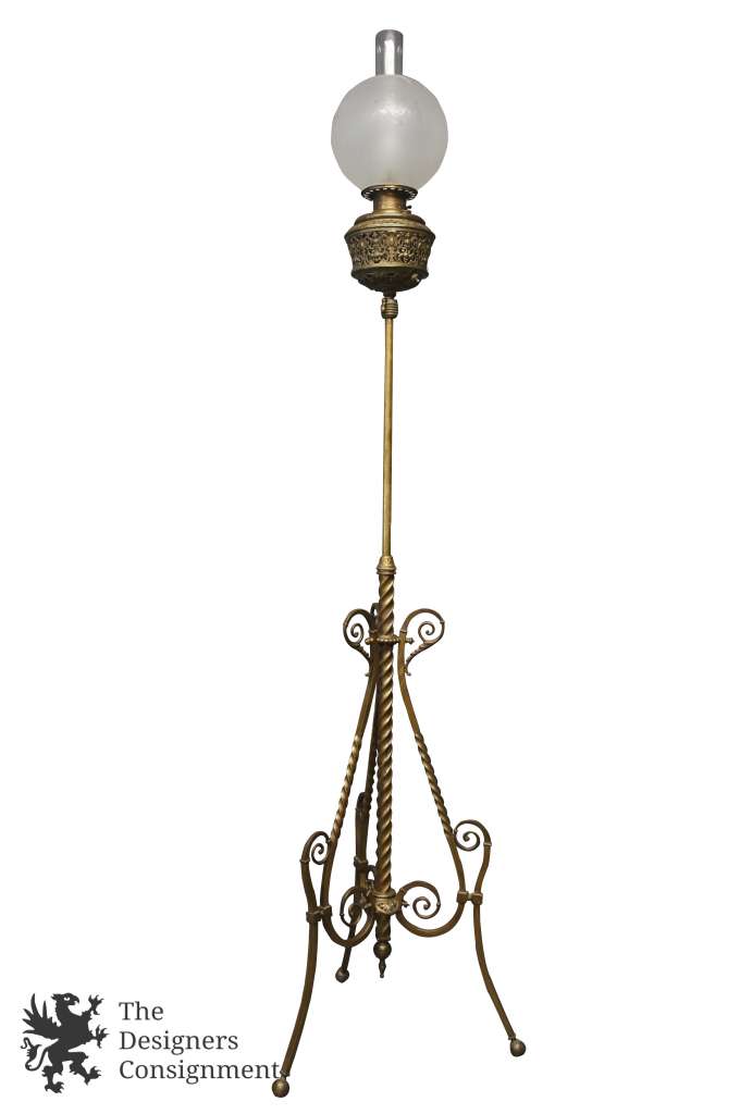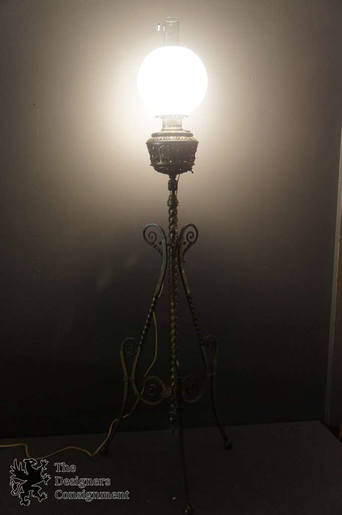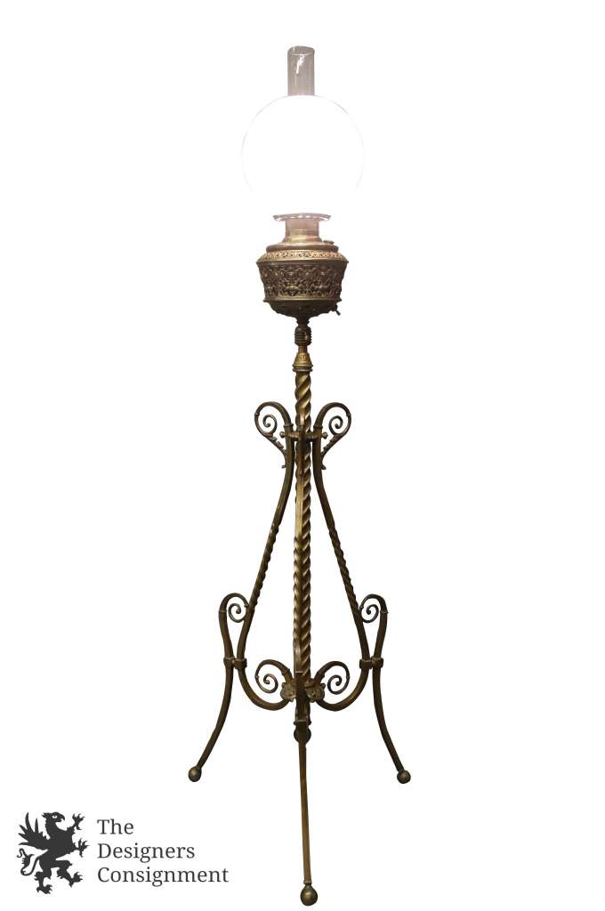 An antique floor parlor/piano lamp named “The Rochester,” patented September 14, 1886, and made by Edward Miller & Company for the Rochester Lamp Company. Once a kerosene floor lamp, which stood beside a piano to light the music pages for the pianist to see while playing, has been rewired for modern use.